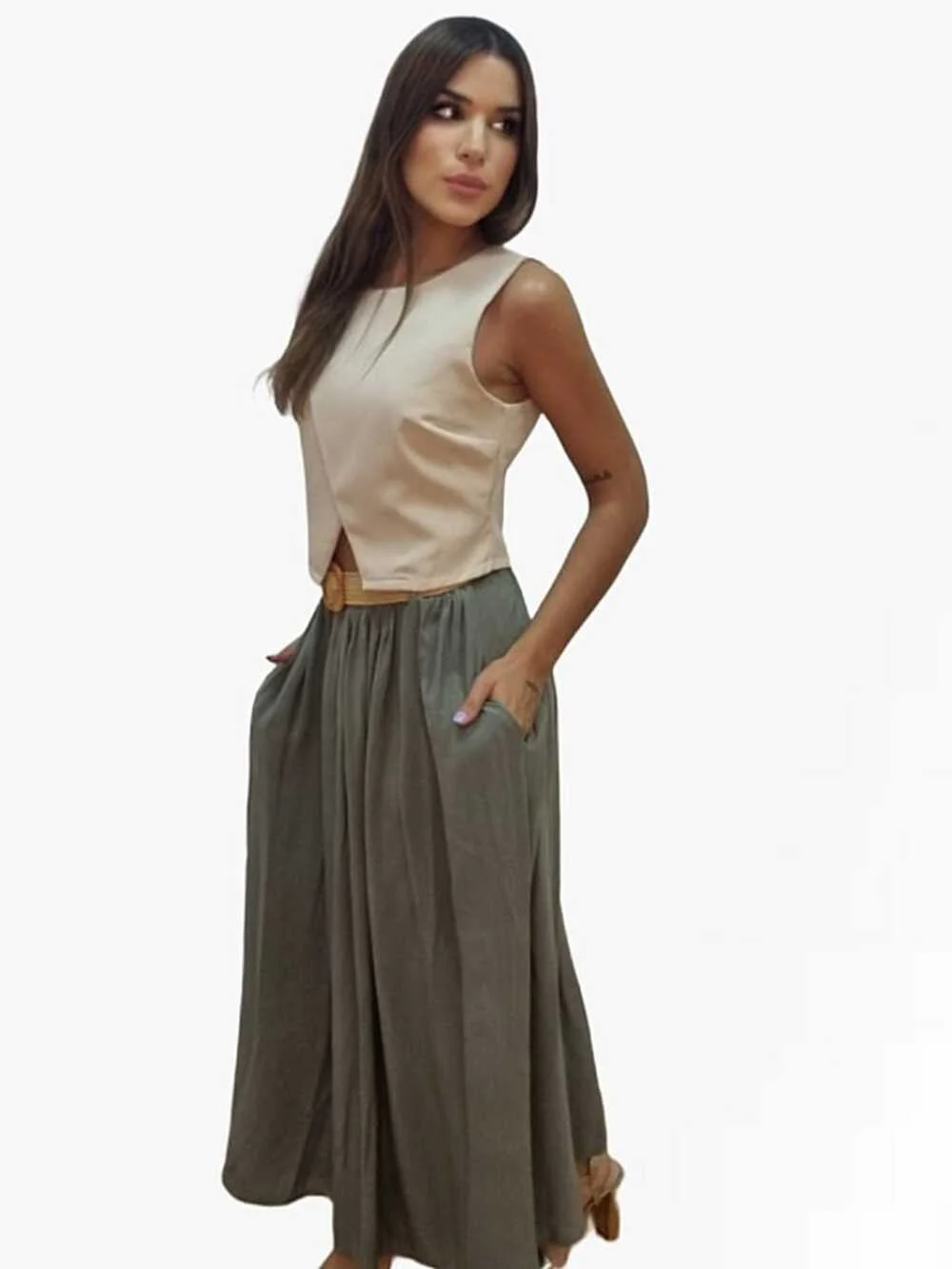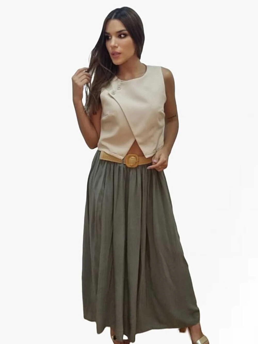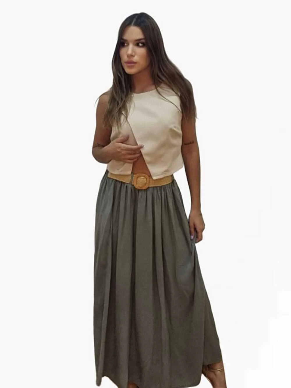 Falda larga fluida con bolsillos laterales, incluye cinturón.