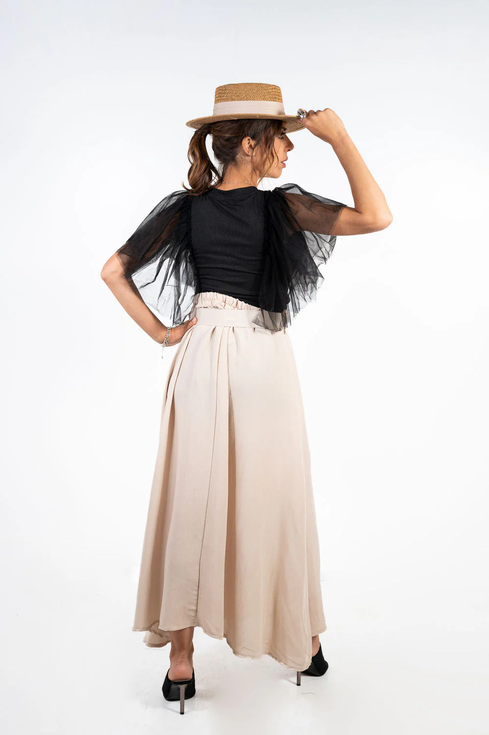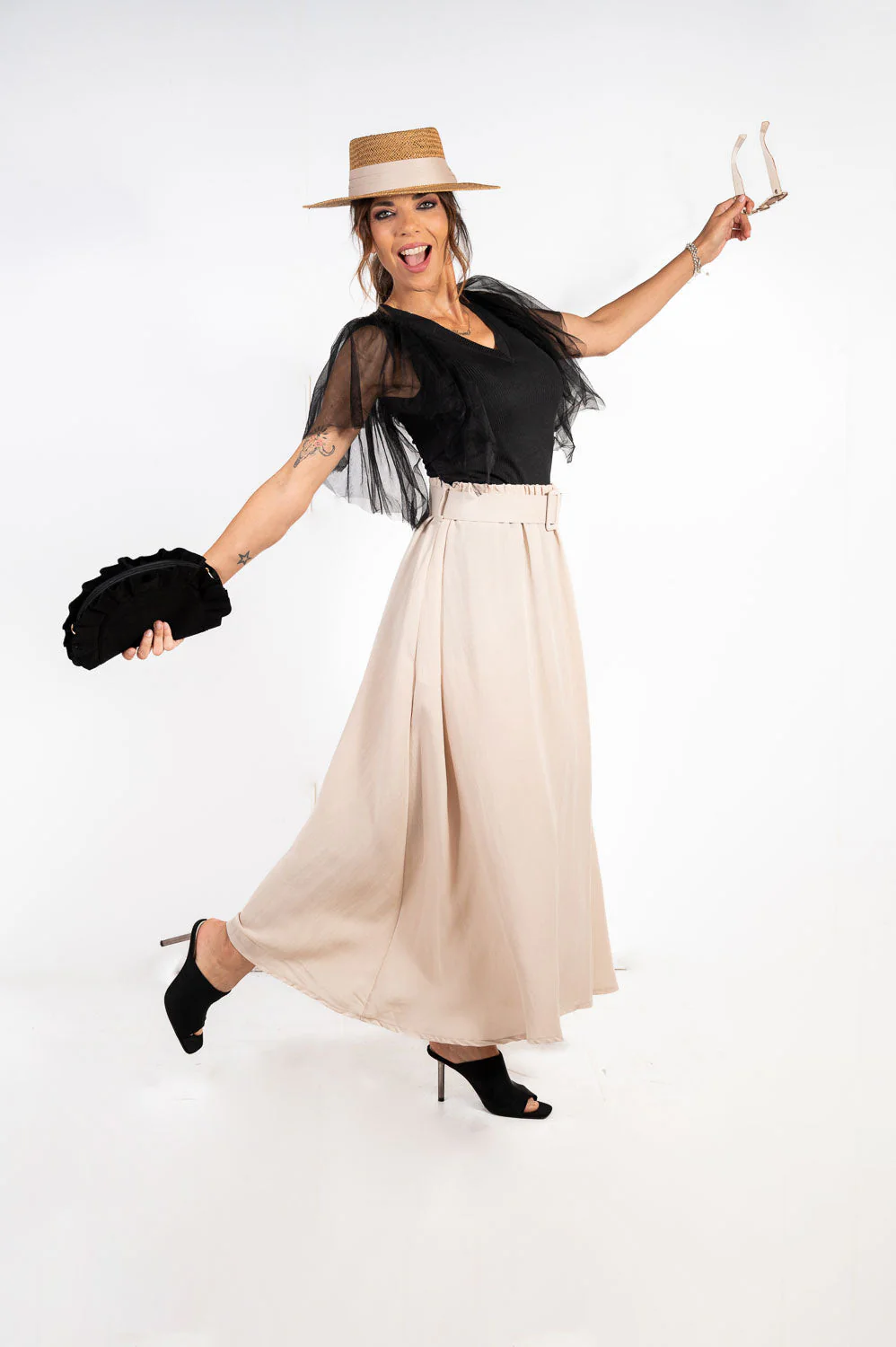 - Talla y corte: Esta falda es talla única, pero se adapta perfectamente de la S a la XL