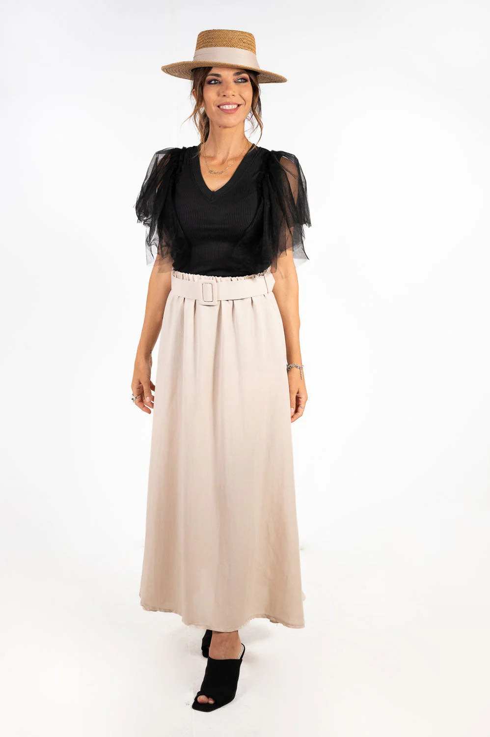 Falda con cintura elástica y cinturón con hebilla rectangular del mismo color.