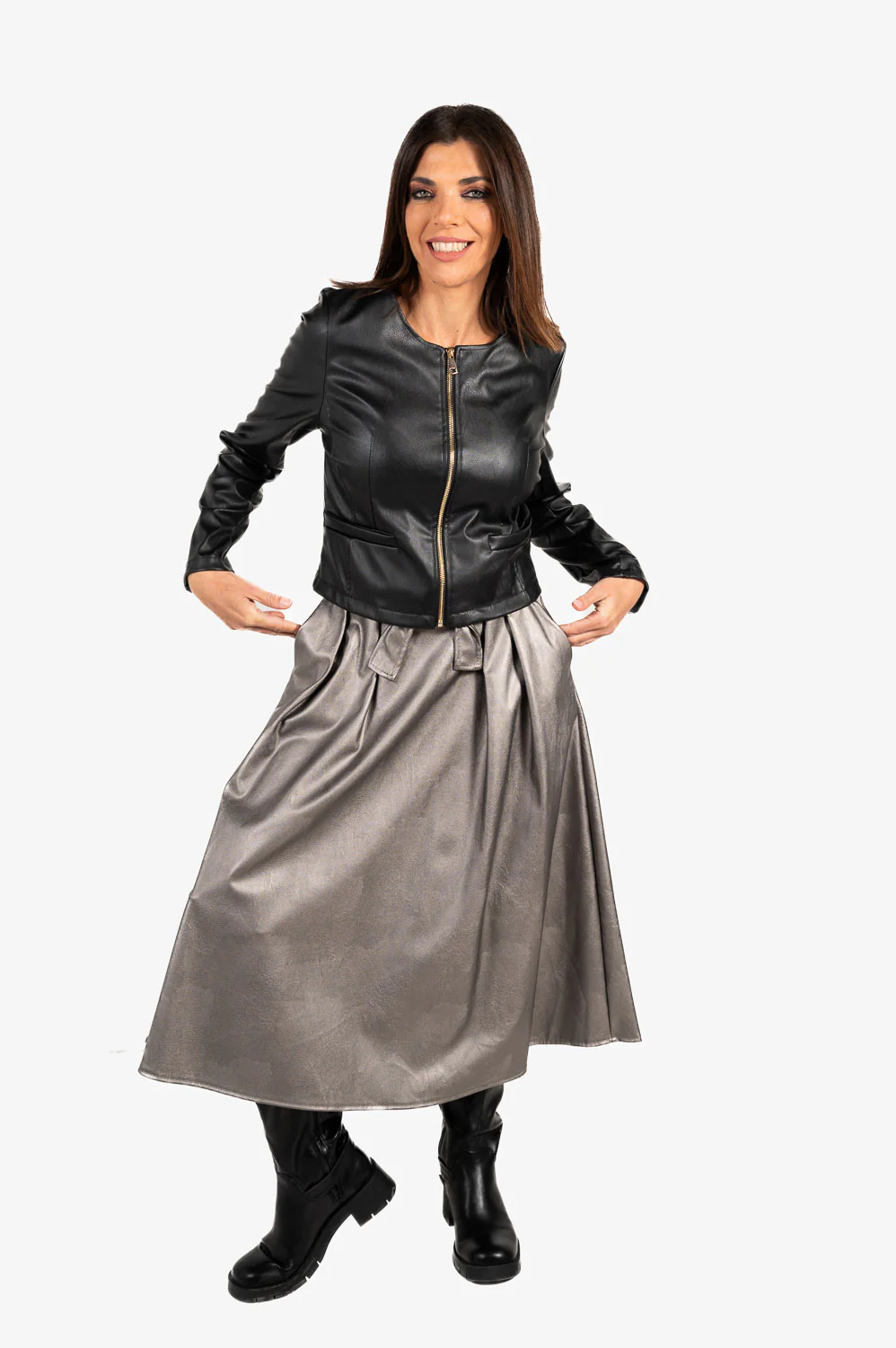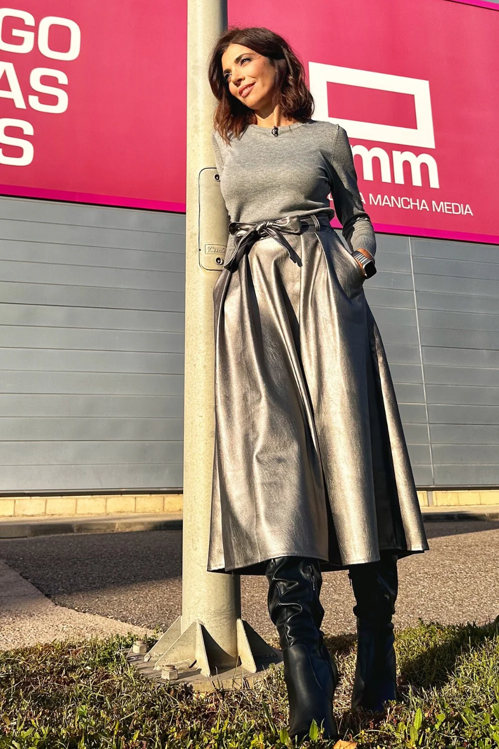 ¡Un top ventas! En varios colores según temporada esta falda polipiel lleva cintura elástica tapada con lazada del mismo material y bolsillos. Corte acampanado y largo midi.