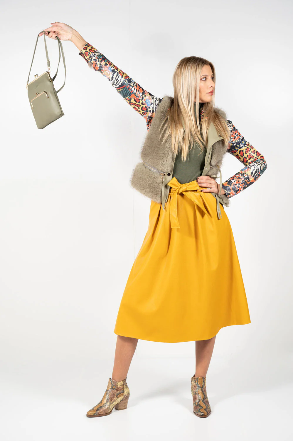 ¡Un top ventas! En varios colores según temporada esta falda polipiel lleva cintura elástica tapada con lazada del mismo material y bolsillos. Corte acampanado y largo midi.