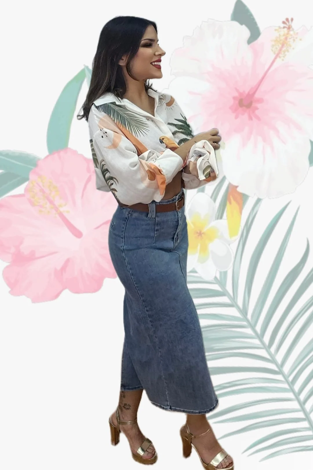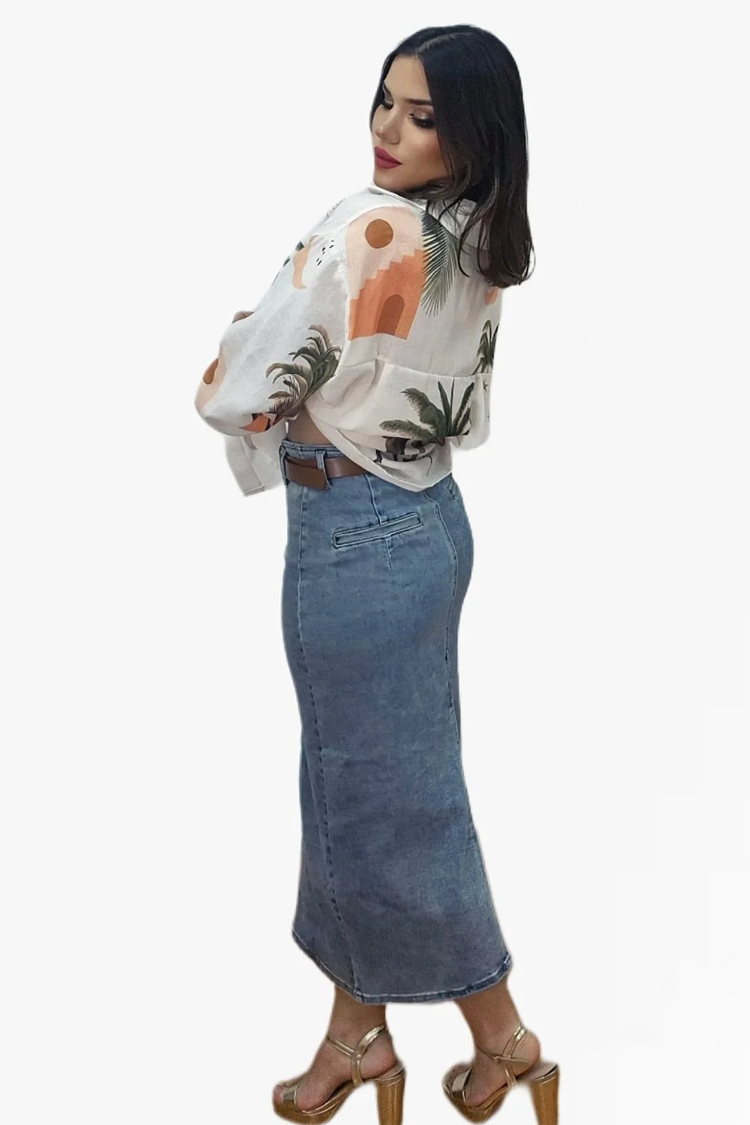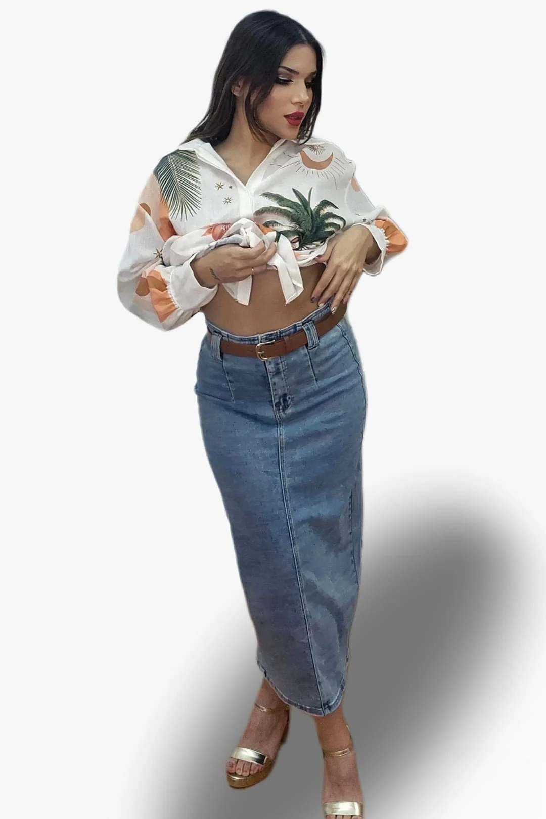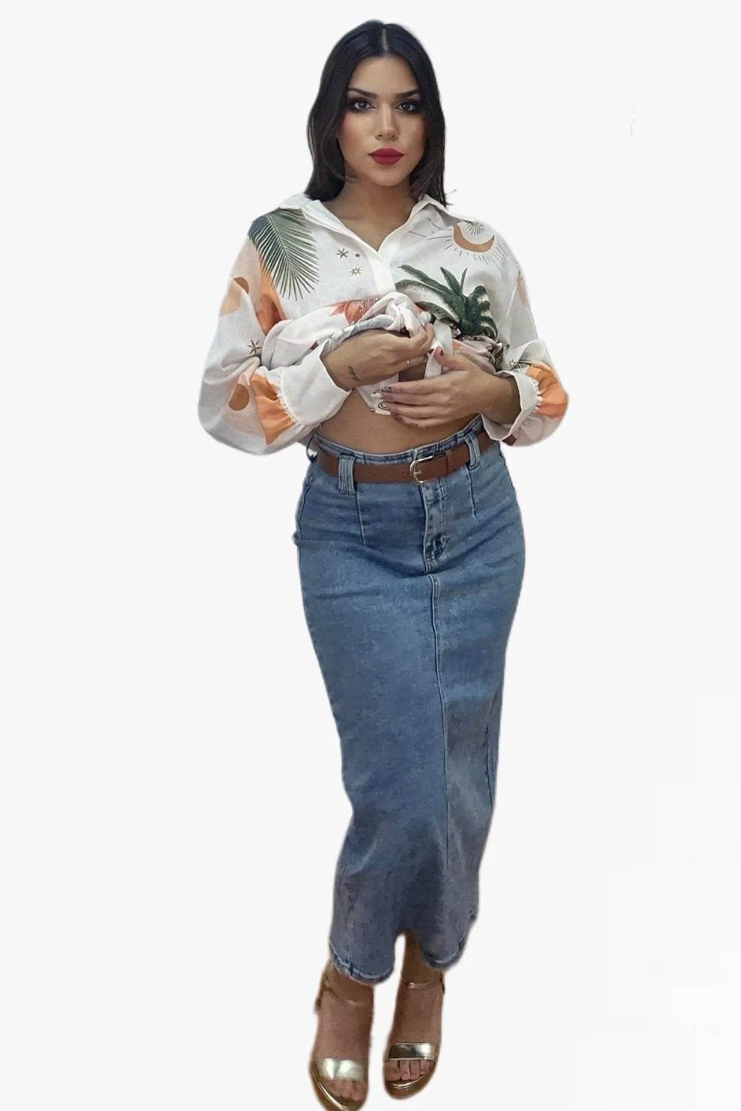 Apuesta por el estilo con esta falda vaquera larga de tubo, una prenda versátil y favorecedora. De corte entallado, incluye pinzas traseras, bolsillos funcionales y una gran abertura en la parte trasera que permite libertad de movimiento. El diseño se completa con un cinturón marrón incluido, ideal para marcar la cintura y dar un toque extra al look.