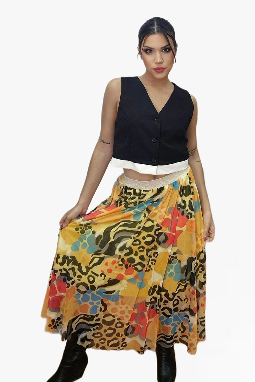 Atrévete con el estilo más rompedor con esta falda de tul midi con estampado animal print en tonos coloridos. Su cintura elástica con acabado brillante aporta un toque glam, mientras que el forro interior garantiza comodidad y evita transparencias.