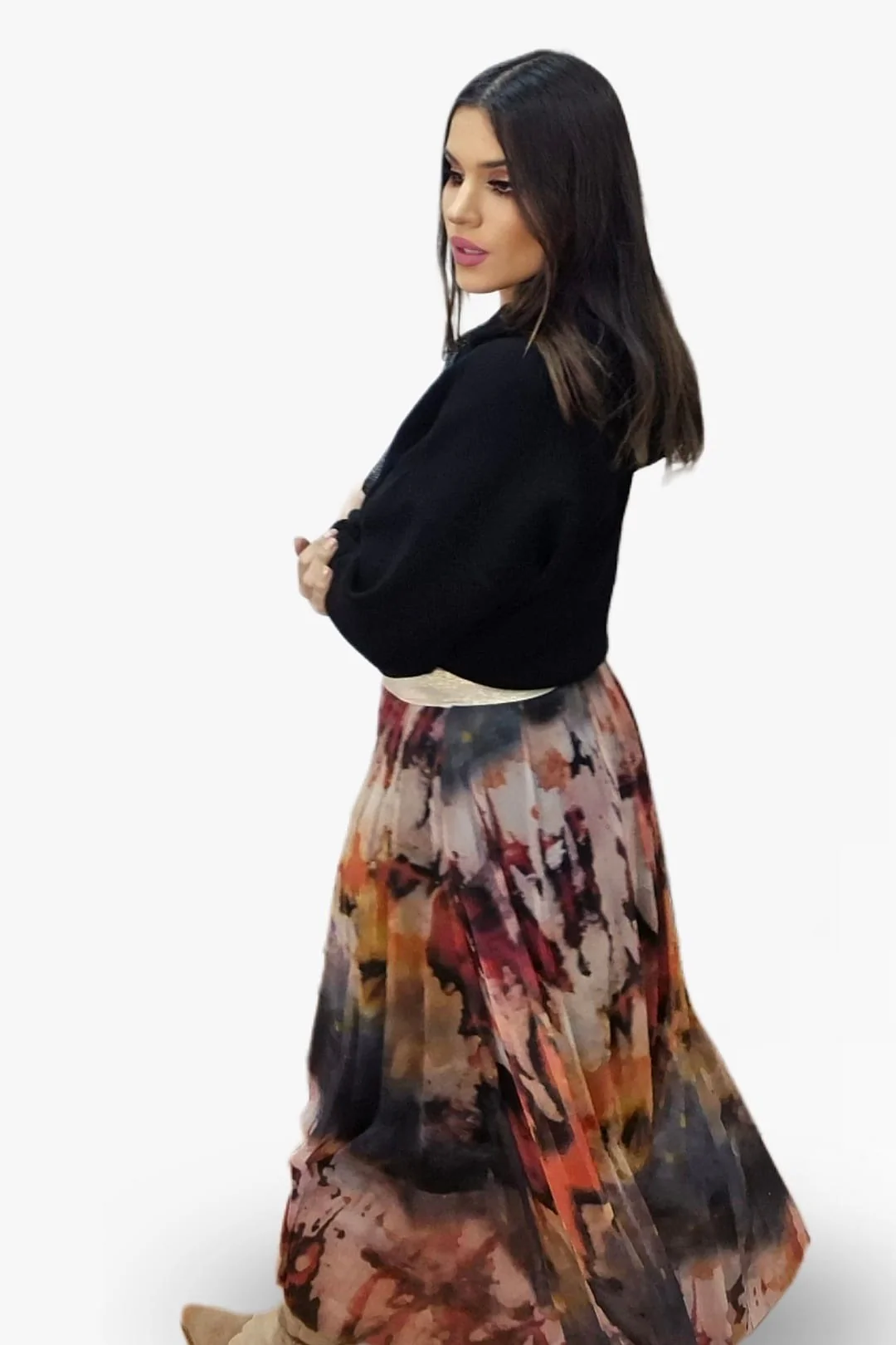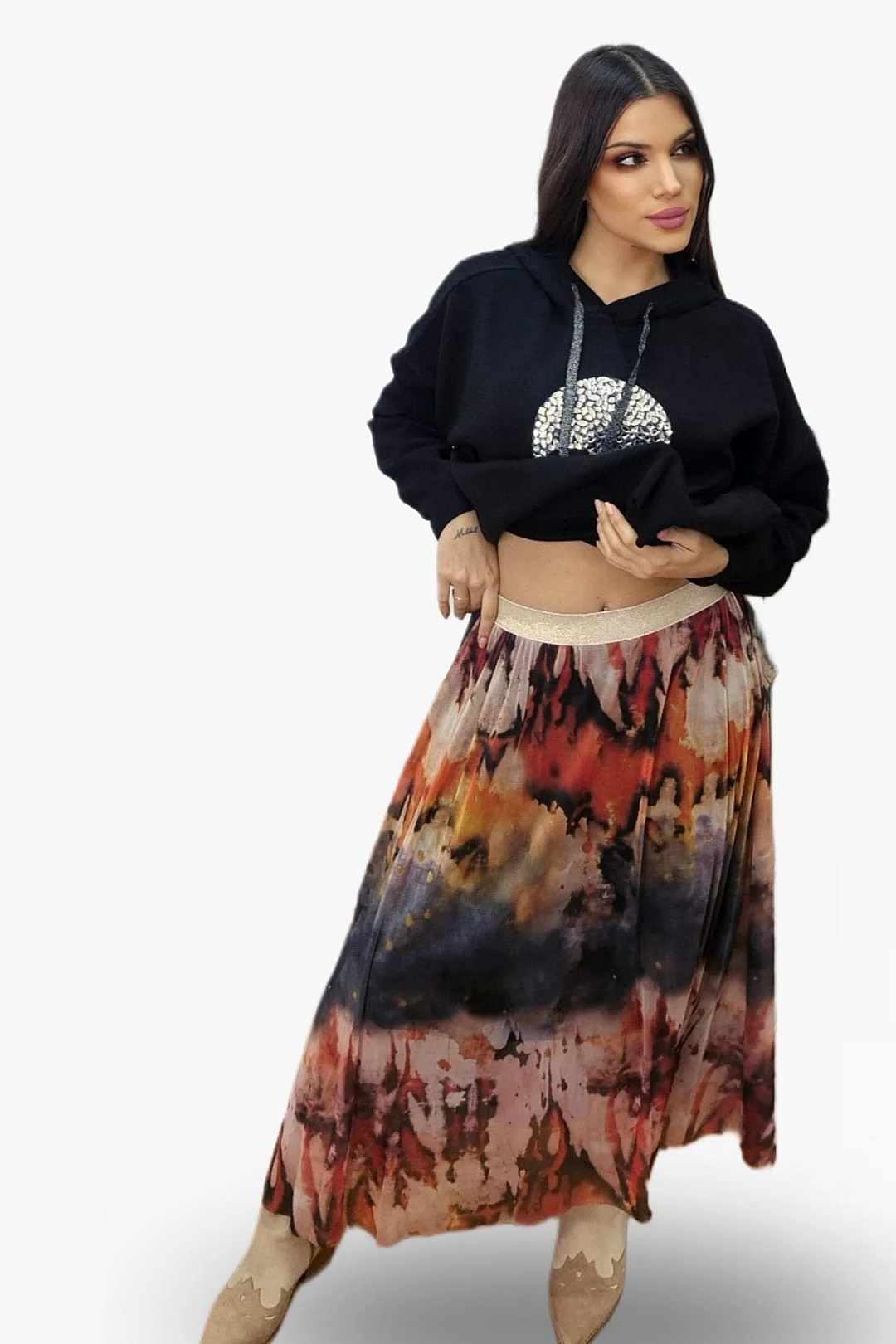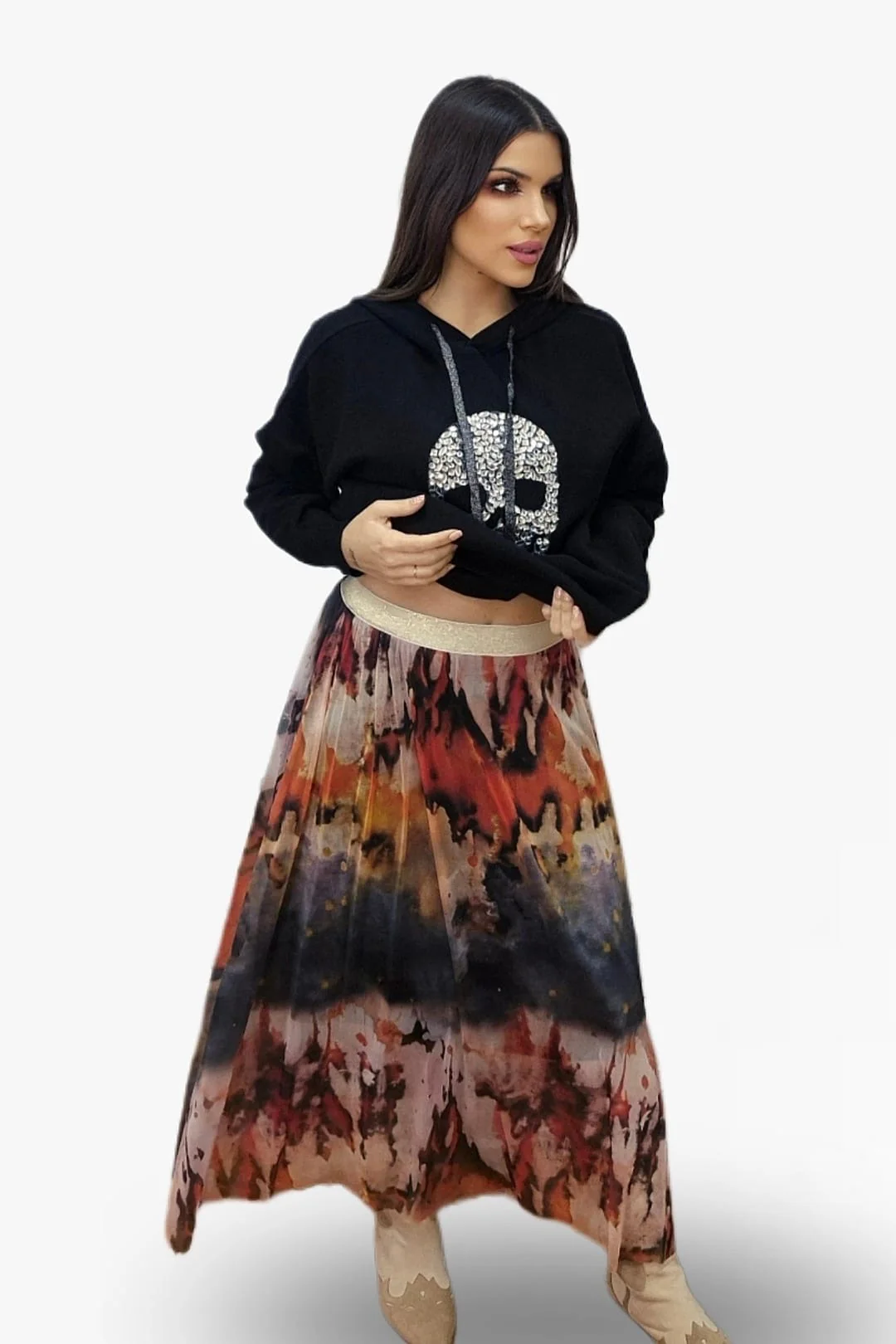 Una falda midi de tul con un estampado efecto volcánico que desprende fuerza, color y personalidad. Su caída fluida aporta un movimiento espectacular, creando un estilo lleno de energía y modernidad.