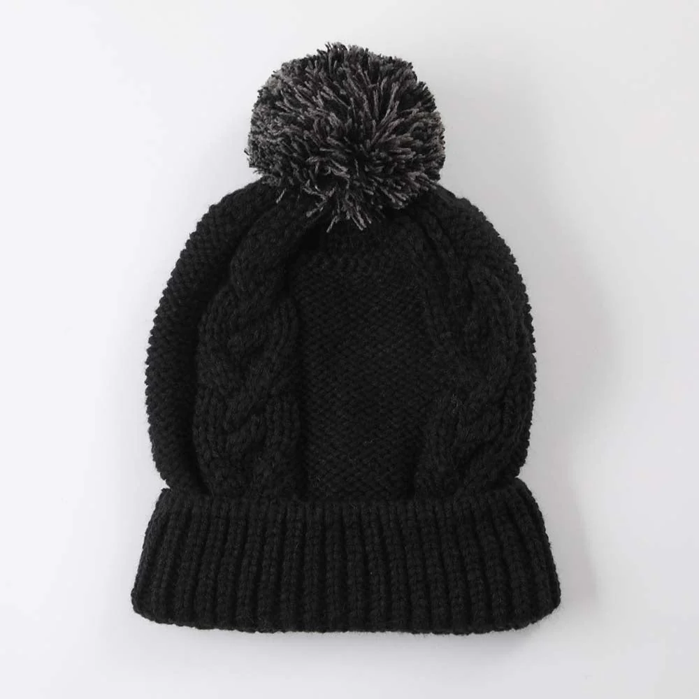 Gorro tejido trenzado de color burdeo con un pompón en su parte superior en tonos rosados.