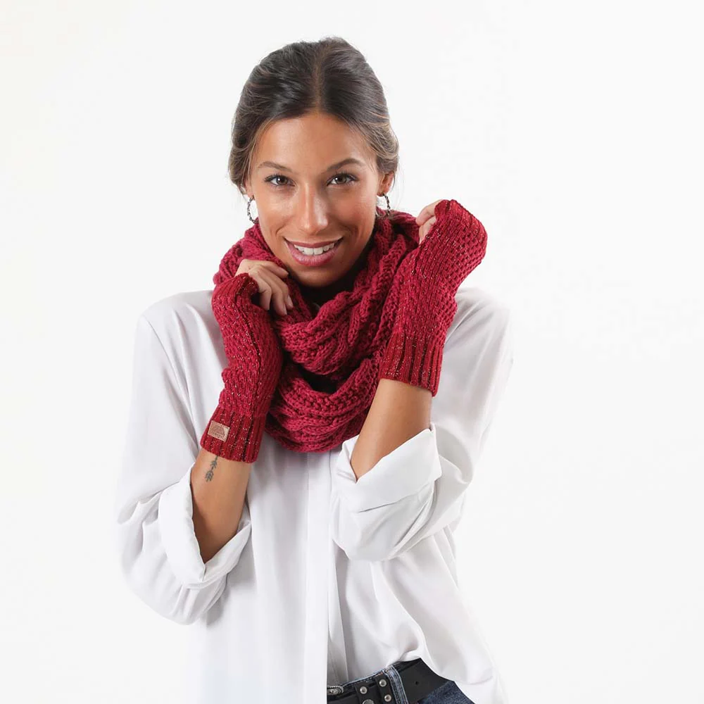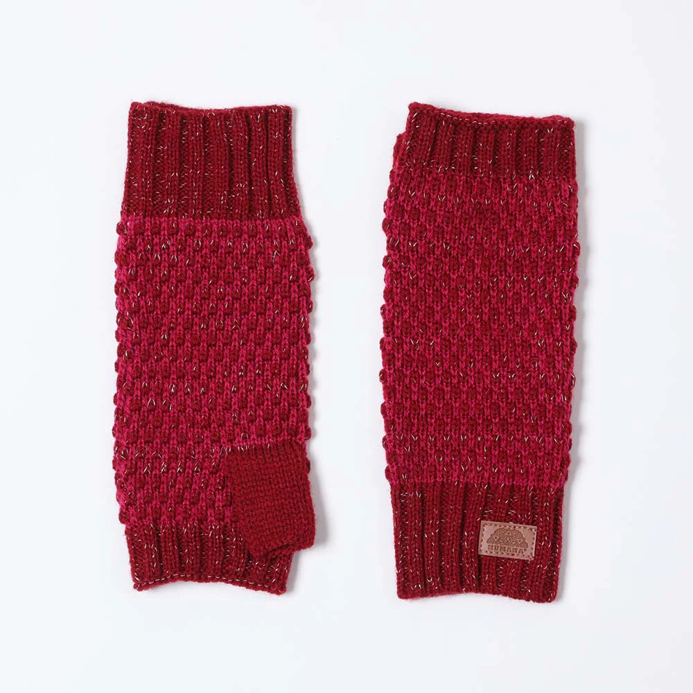 Guantes Humana Zu de color rojo. Tejido bicolor rojo y fucsia con hilos plateados.