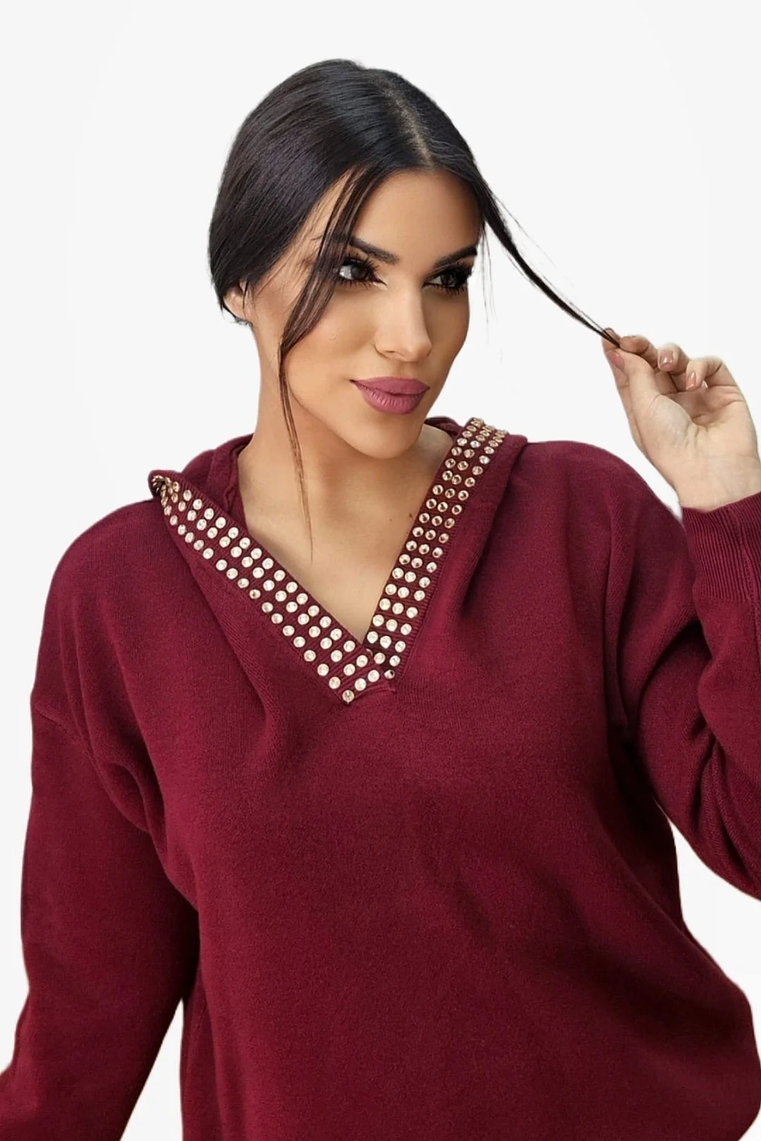 Un jersey ideal para elevar tus looks del día a día con un toque moderno y muy KOKER. Su diseño incorpora una capucha decorada con tachuelas brillantes y un escote con el mismo detalle, aportando un aire juvenil, femenino y sofisticado sin renunciar a la comodidad.