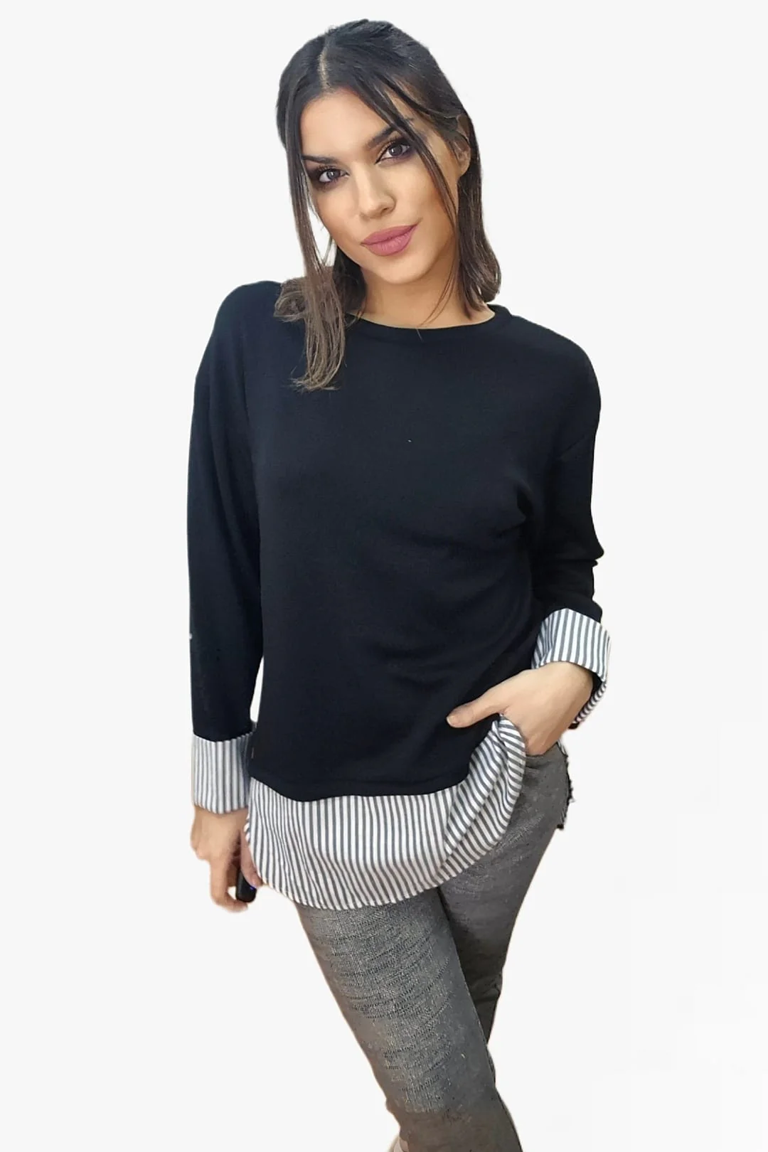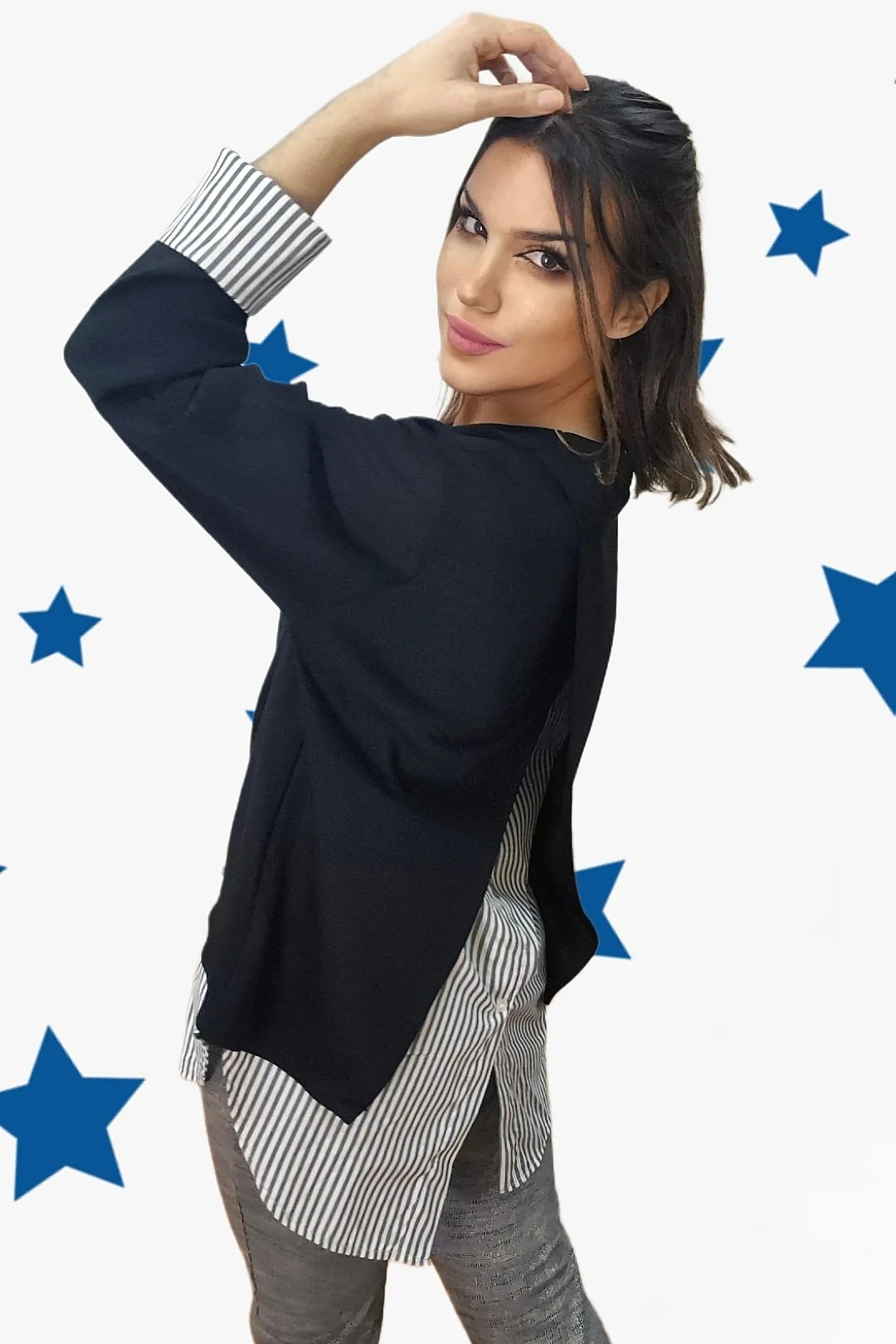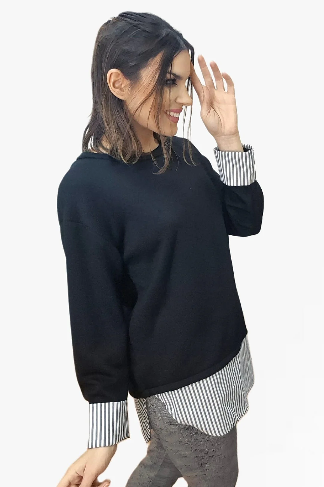 Jersey cuello redondo, combinado con camisa. No se pueden separar. Espalda cruzada.