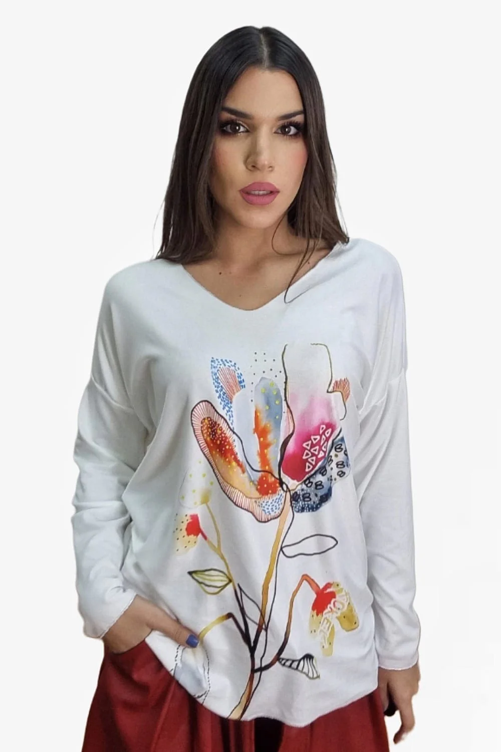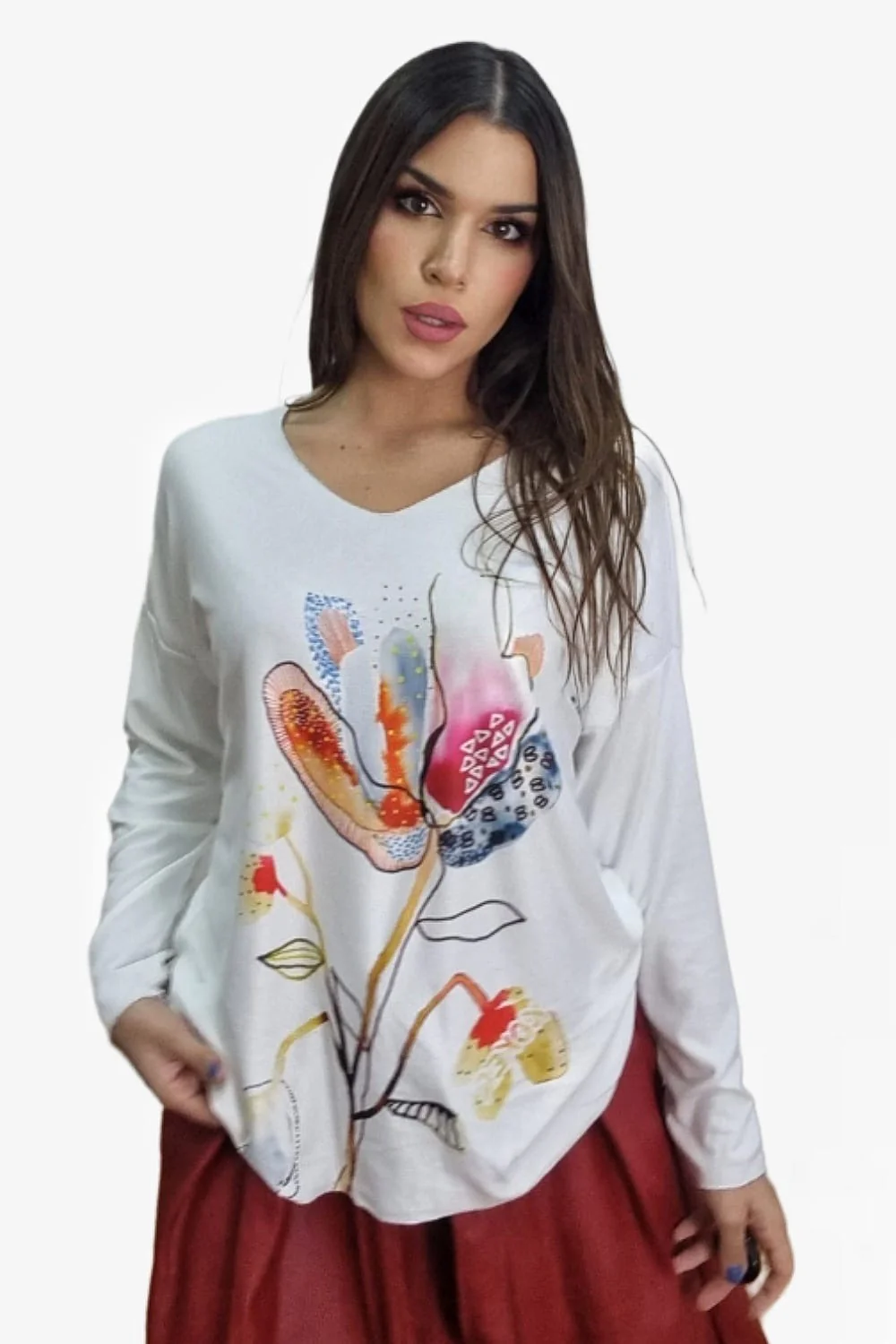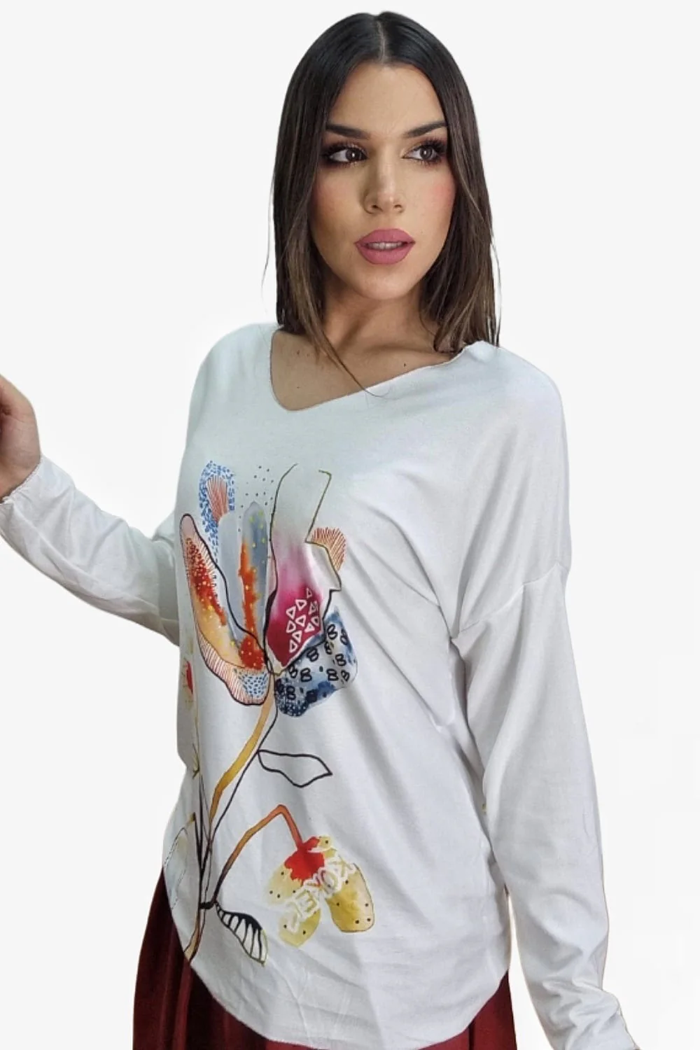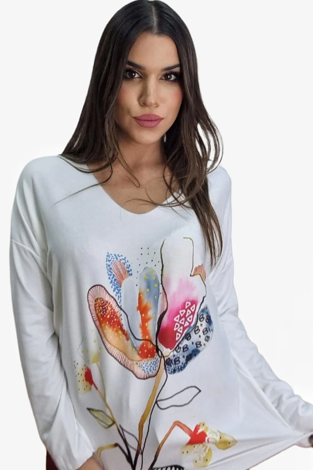 Jersey fluido de punto con manga larga. Estampado variado y colorido. Ideal para llevar con vaquero y leggins y dar un toque divertido y alegre a tu look.