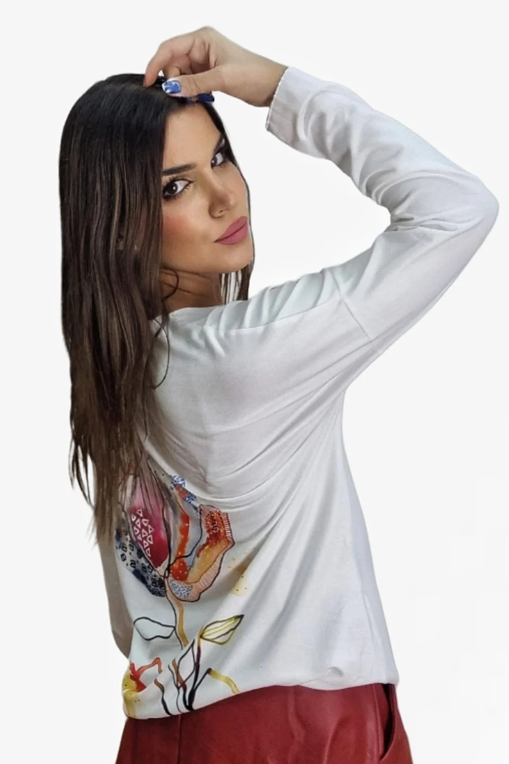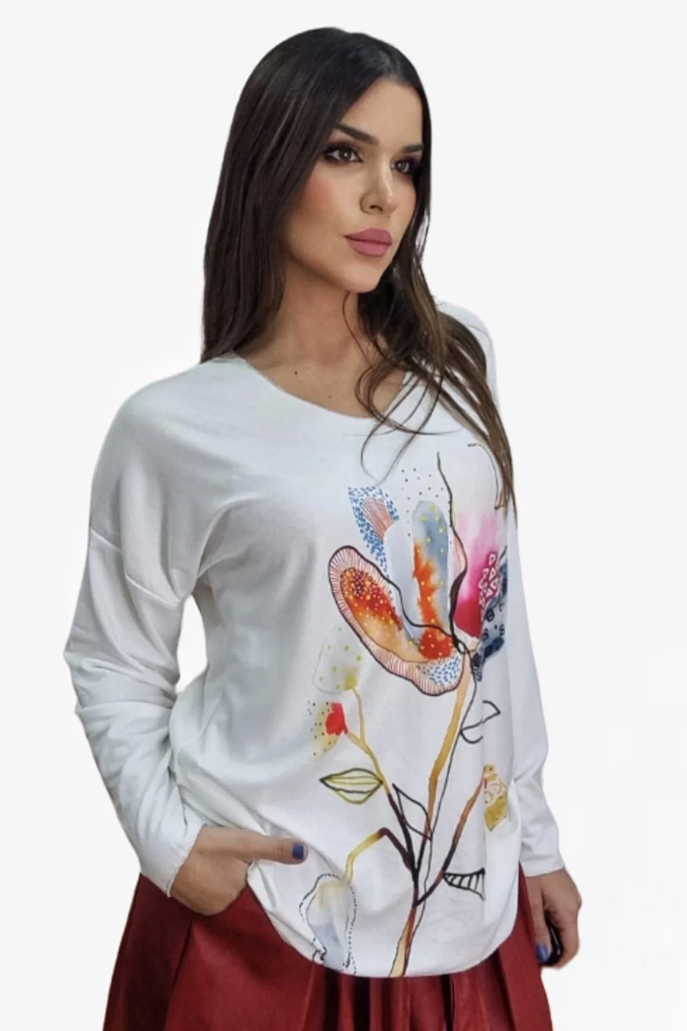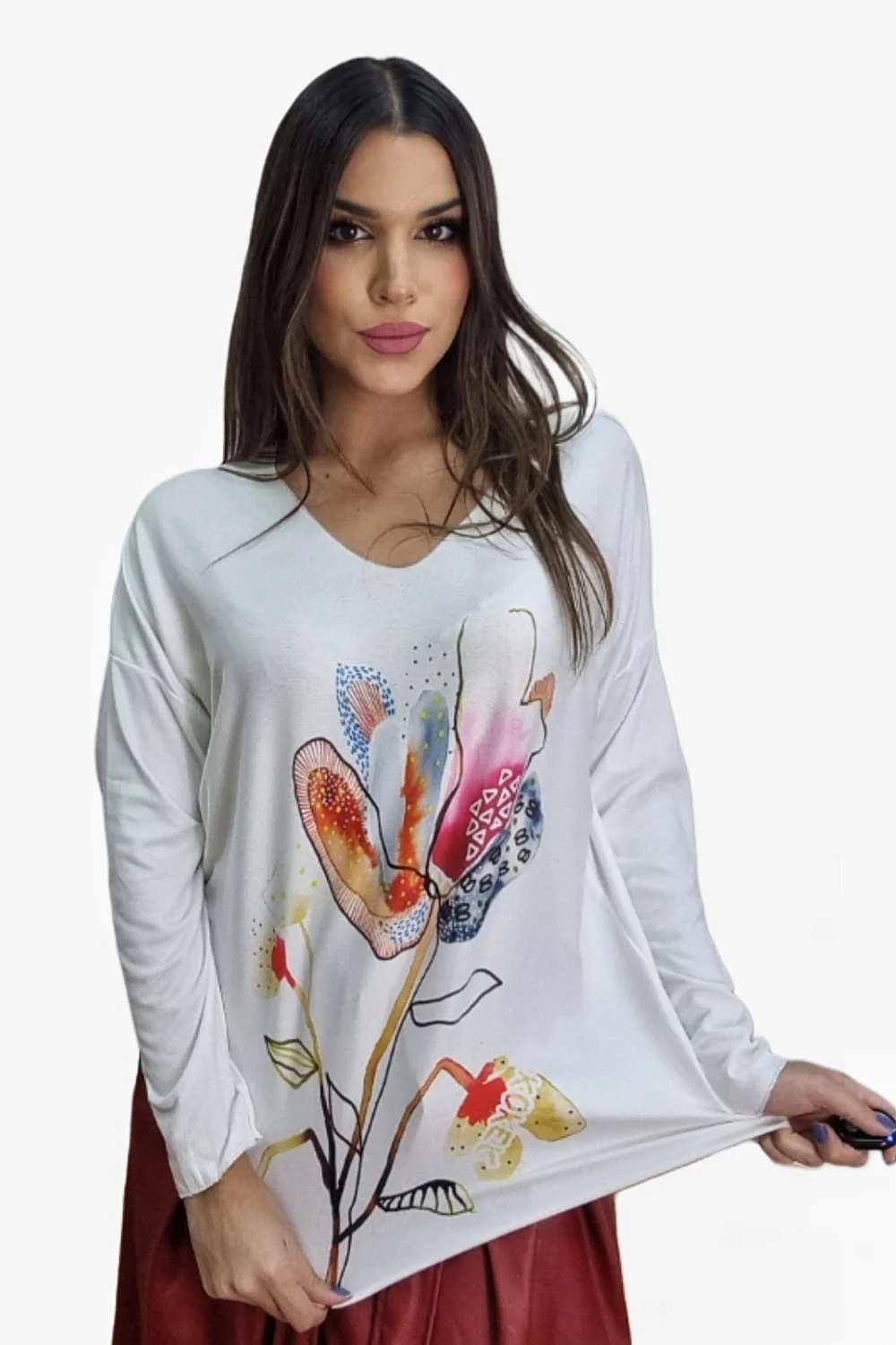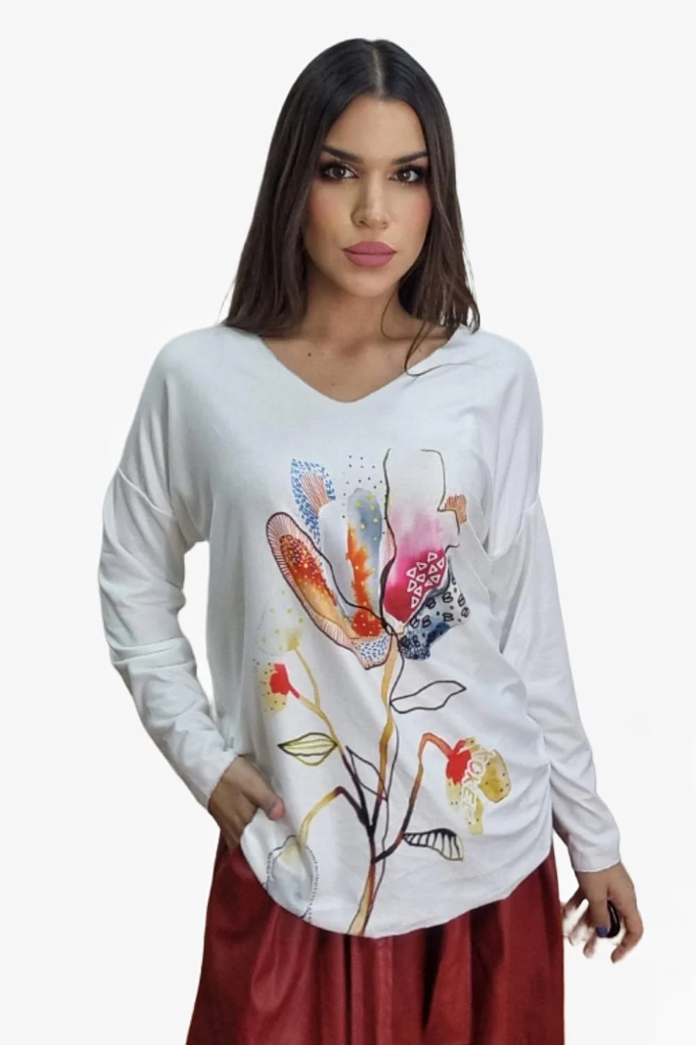 Jersey fluido de punto con manga larga. Estampado variado y colorido. Ideal para llevar con vaquero y leggins y dar un toque divertido y alegre a tu look.