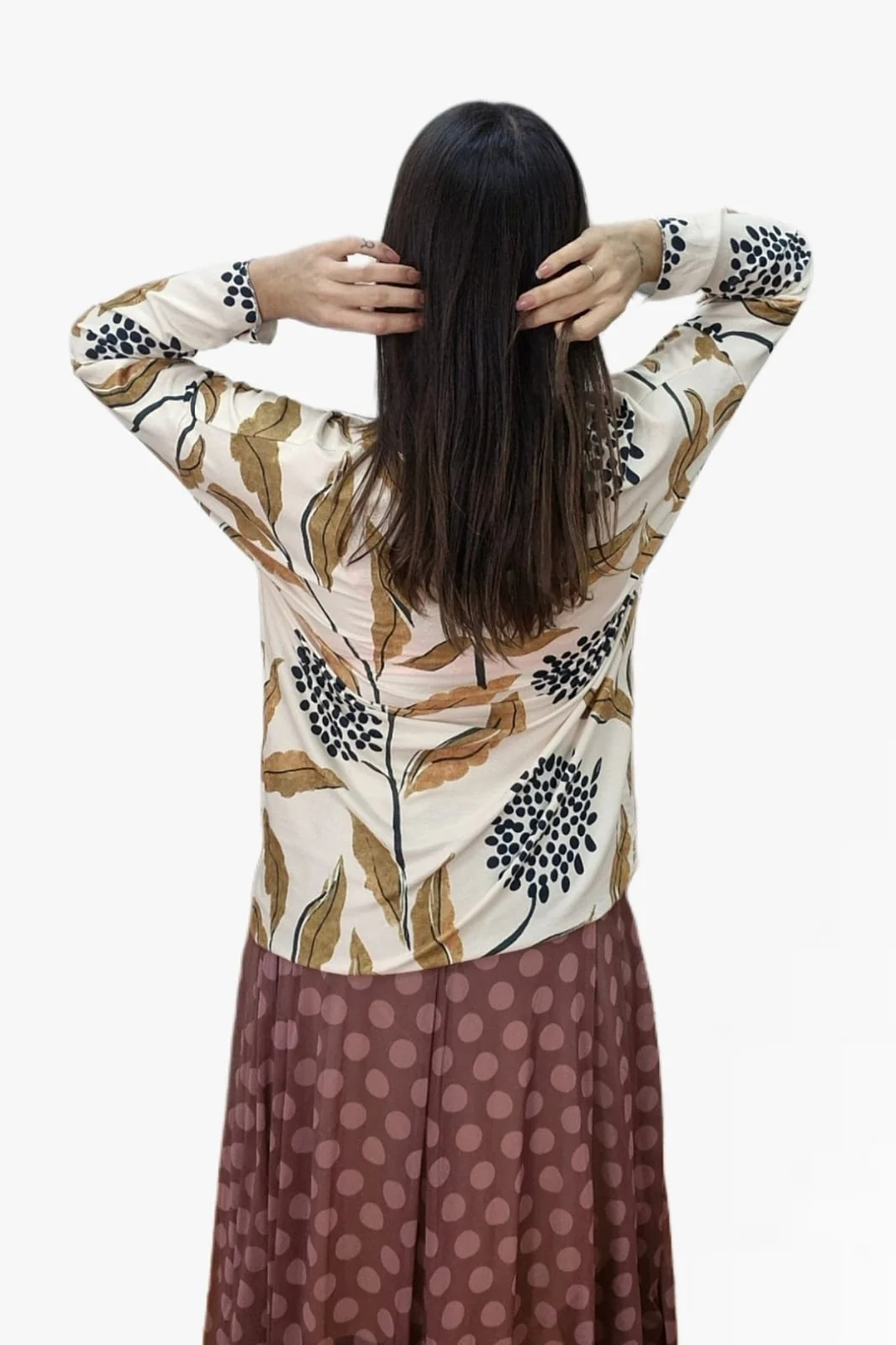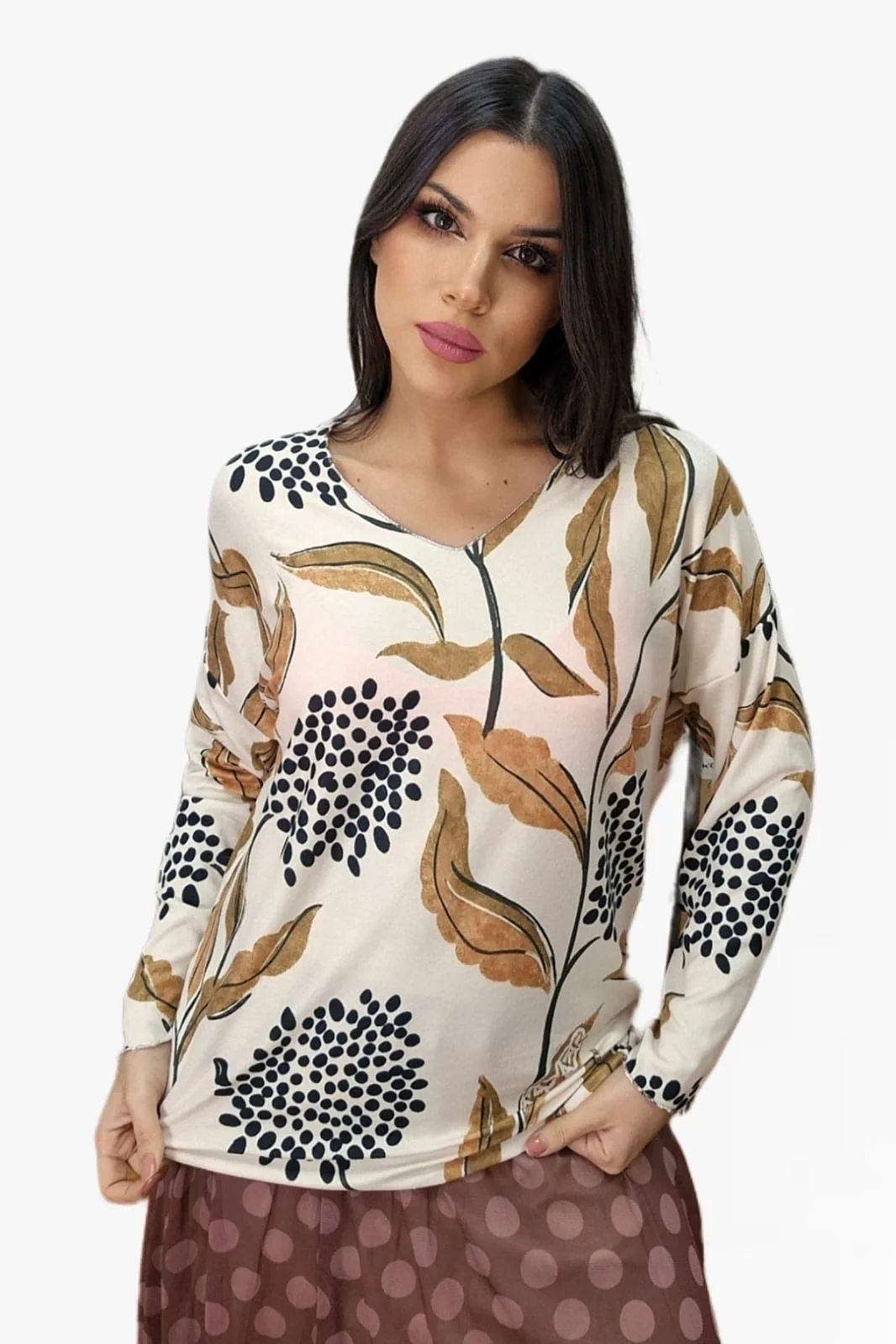 Su tejido elástico y suave se adapta al cuerpo sin oprimir, ofreciendo una caída fluida que estiliza la silueta. El cuello en pico aporta un toque femenino y desenfadado, mientras que el estampado se convierte en el auténtico protagonista del look.