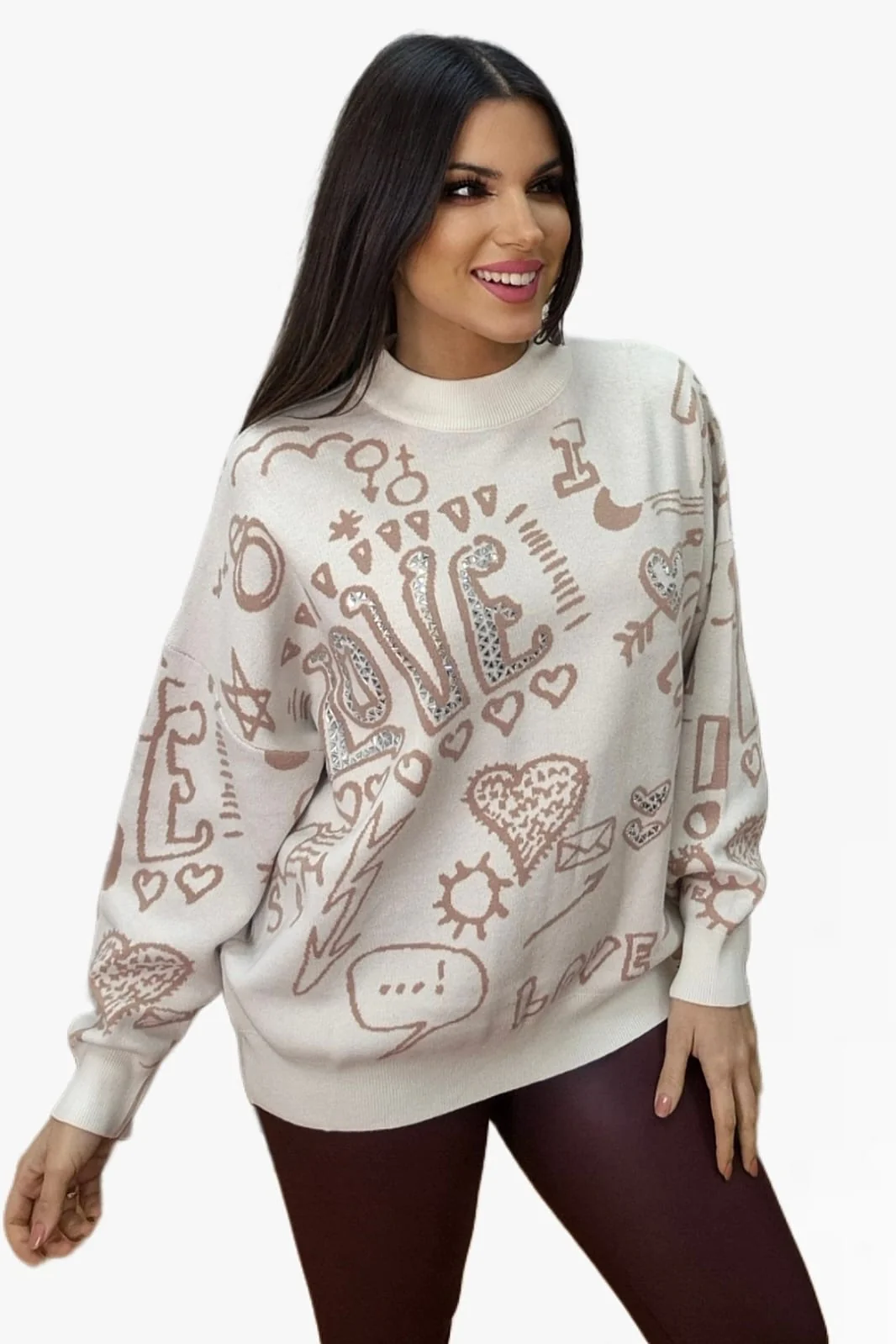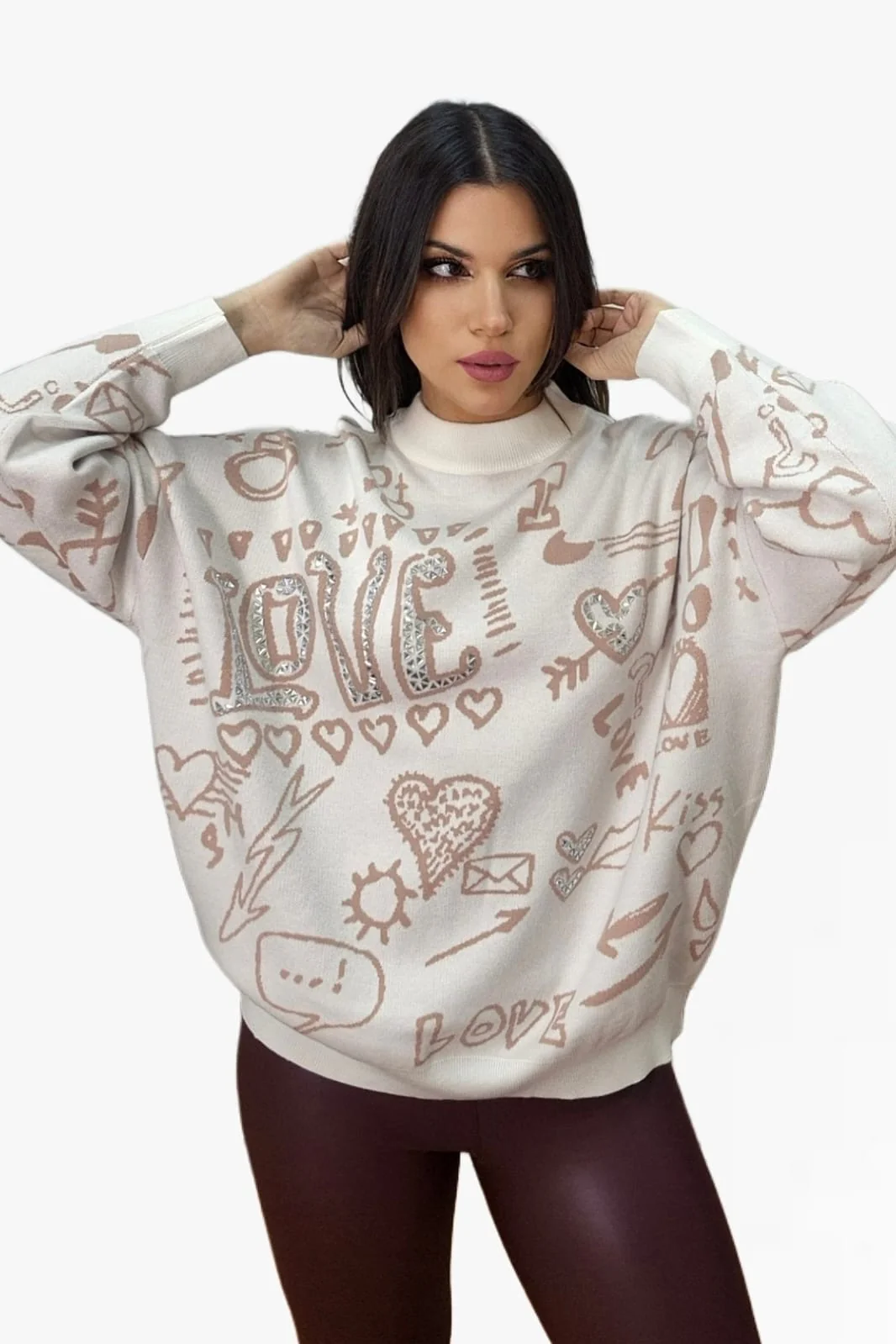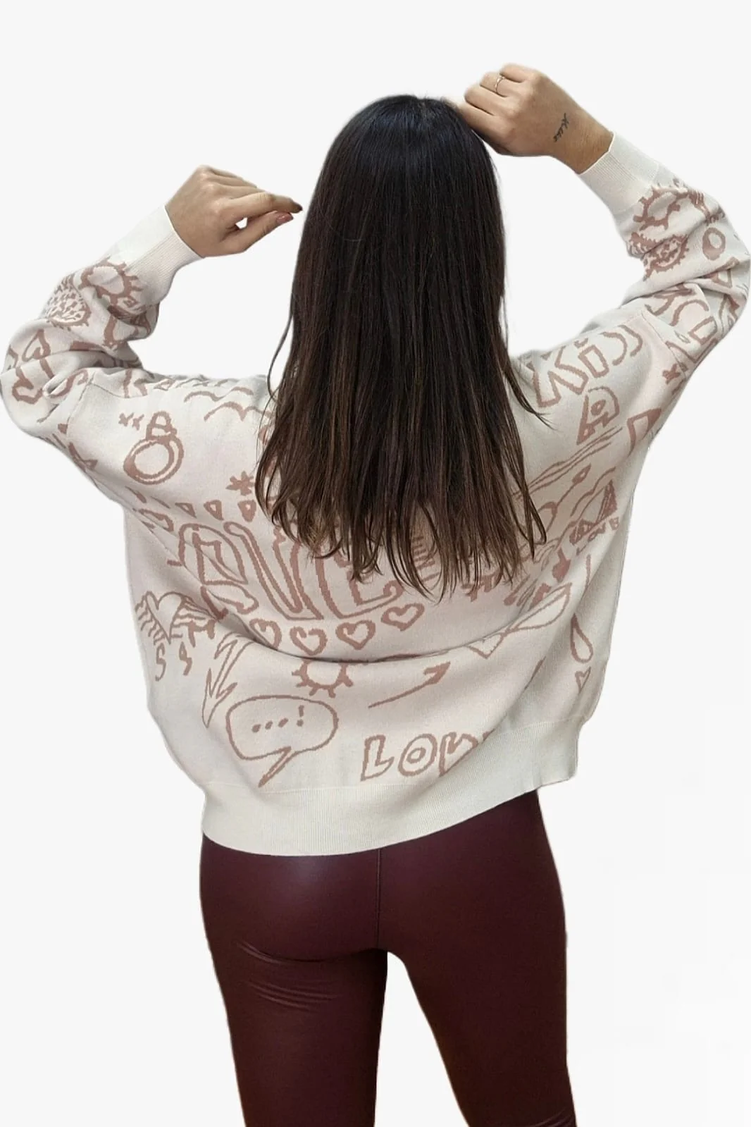 Un jersey de punto con un diseño love comic lleno de personalidad que no pasa desapercibido. Sus ilustraciones y mensajes en contraste aportan un aire divertido y original, convirtiéndolo en la prenda perfecta para dar un giro atrevido a tus looks diarios.