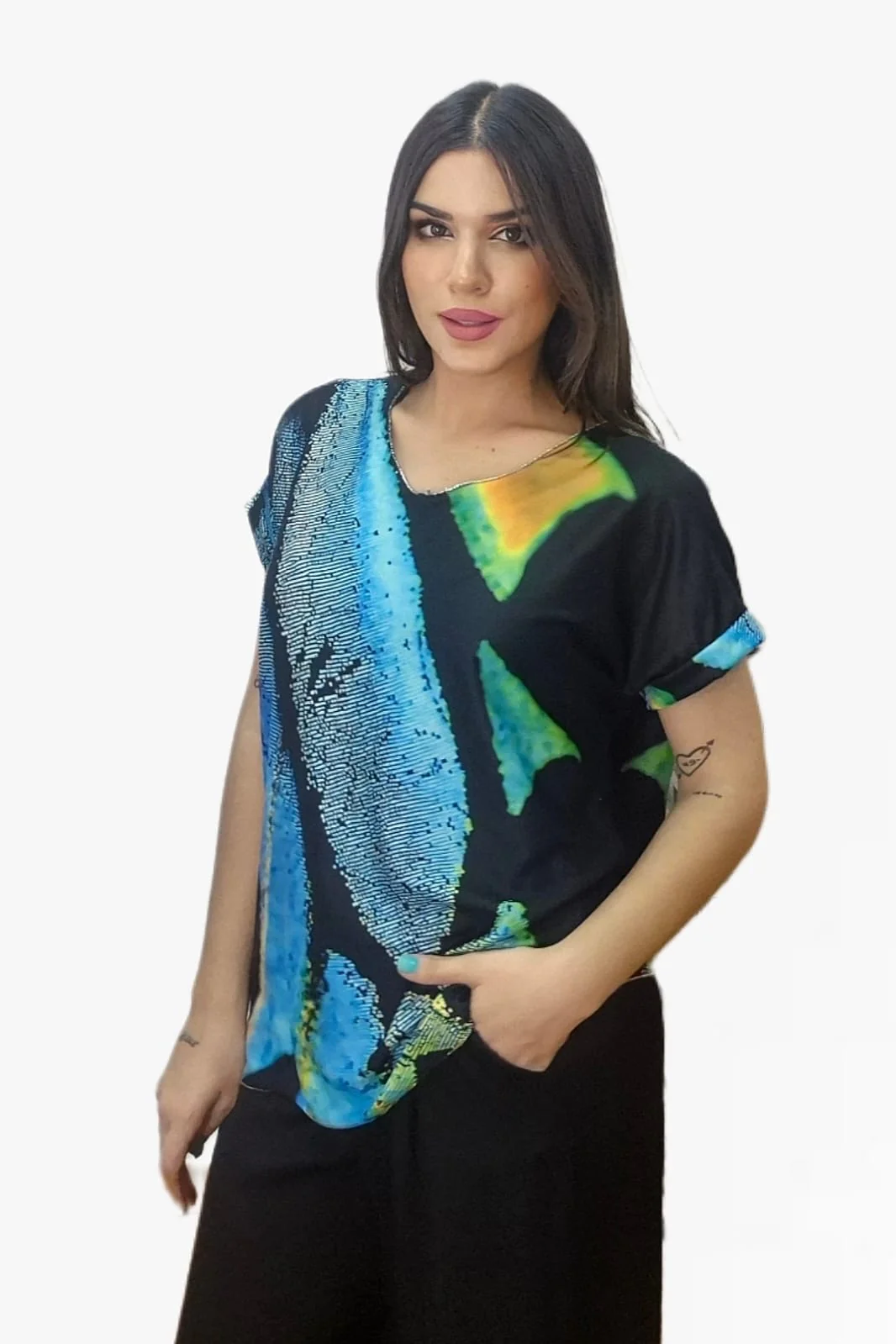 jersey de manga corta con estampado es una explosión de color que transforma cualquier look básico en algo especial. Su tejido suave y elástico se adapta cómodamente a distintas siluetas gracias a su corte en talla única, con un diseño que no marca y sienta genial.