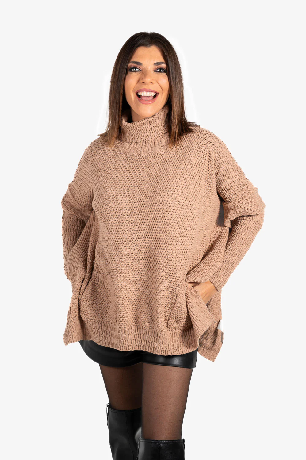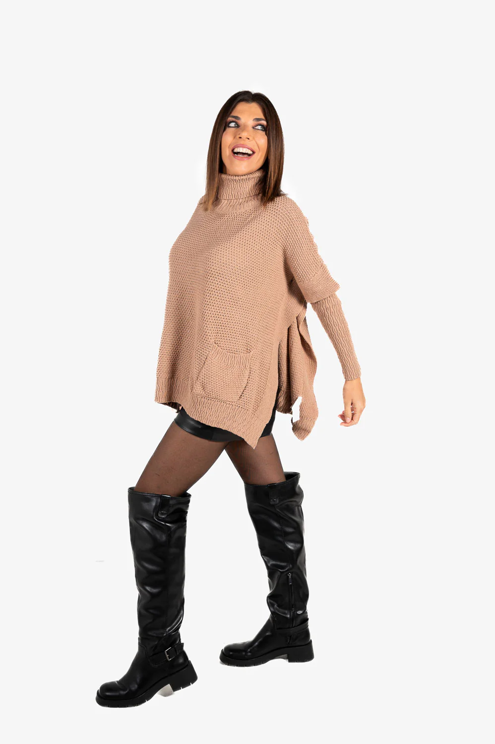 Jersey de punto con cuello alto, manga murciélago, apertura lateral, oversize y bolsillos delanteros.