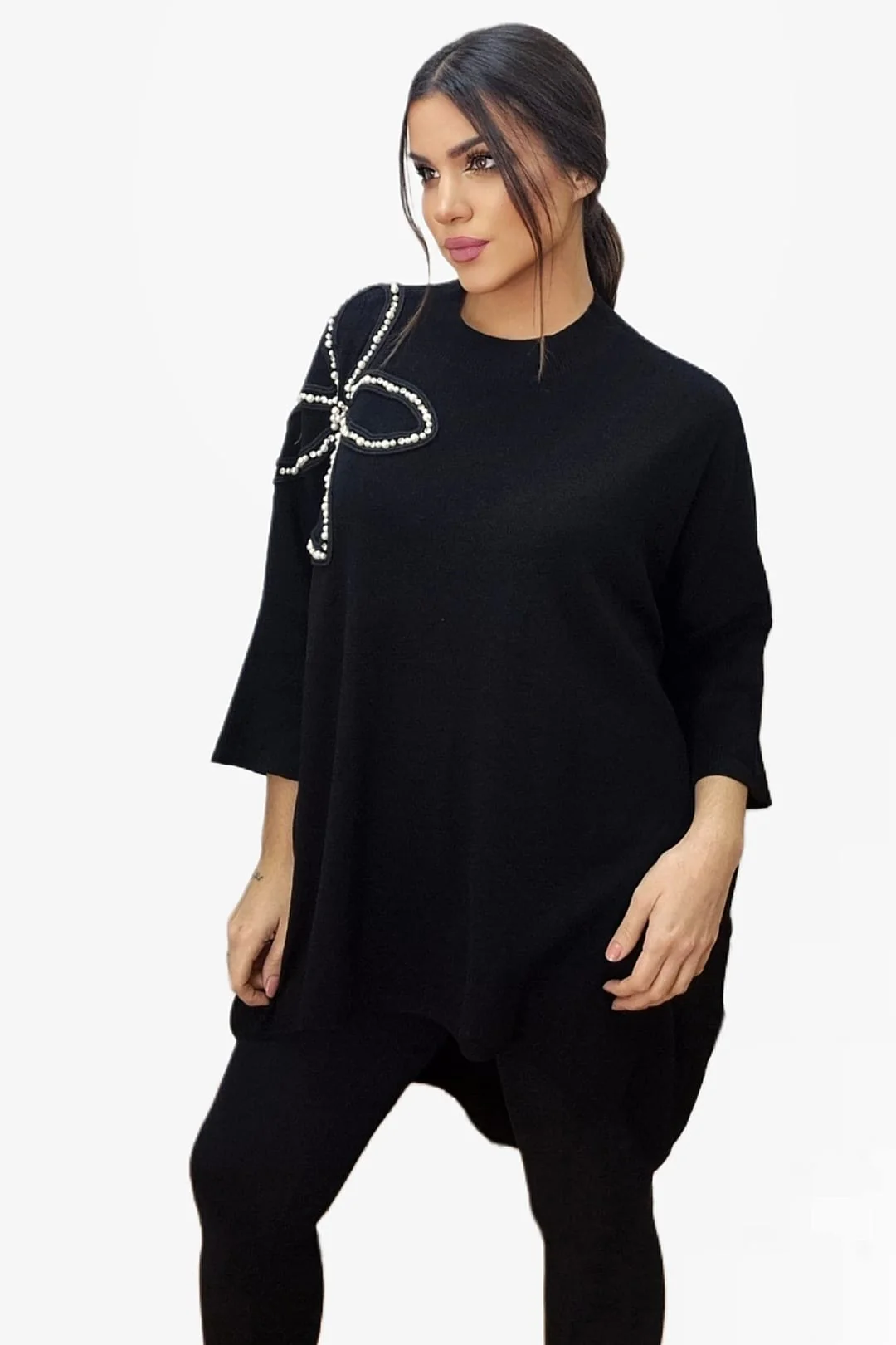 Un jersey amplio, suave y con un diseño que marca la diferencia gracias a su aplicación de flor en perlas, que aporta un toque luminoso y sofisticado. Su corte oversize ofrece una caída fluida y muy favorecedora, ideal para vestirte con estilo sin renunciar a la comodidad.