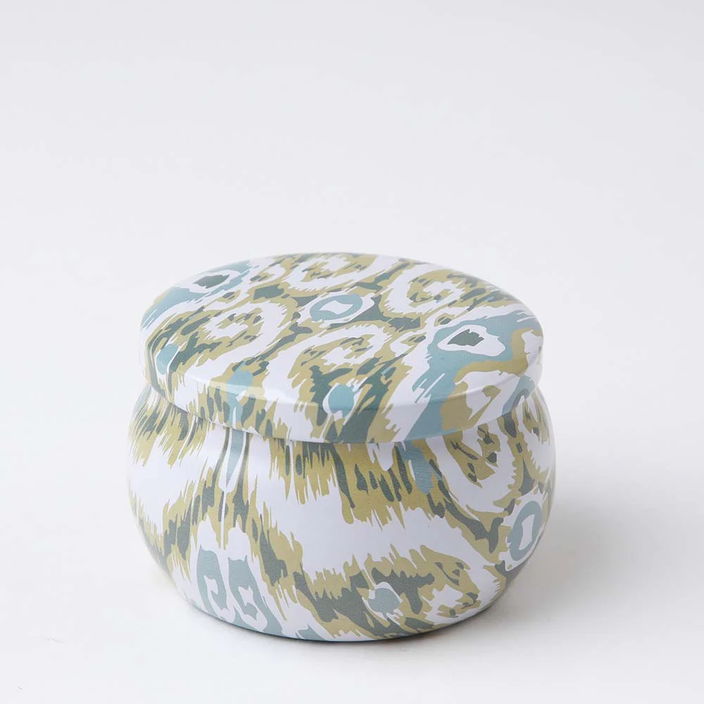 Joyero Humana Ornella de color verde. Joyero metálico con tapa con diseño abstracto en color verde, blanco y celeste.