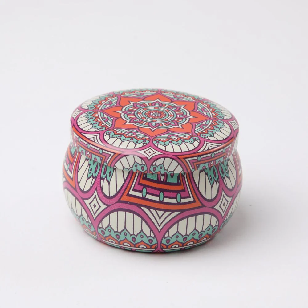 Joyero metálico redondo mandala rosado, blanco, celeste y naranjo