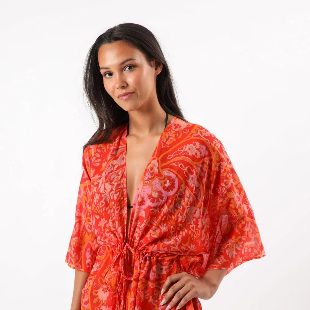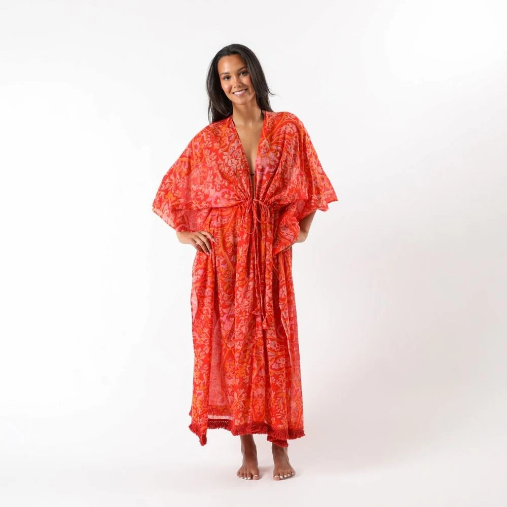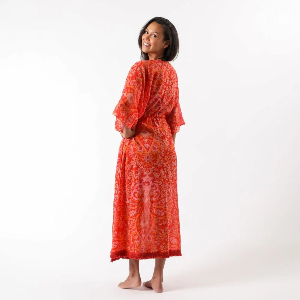 Kimono abierto con cierre de tira tipo caftán color verde con diseño de estampado tipo paisley en tonos rojos y flecos en los bordes.