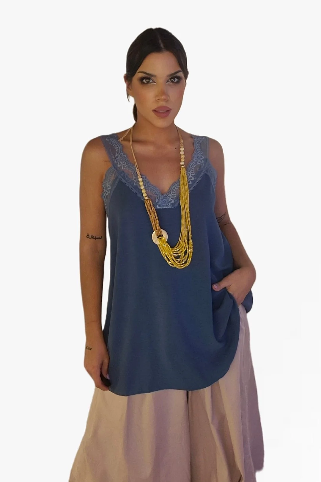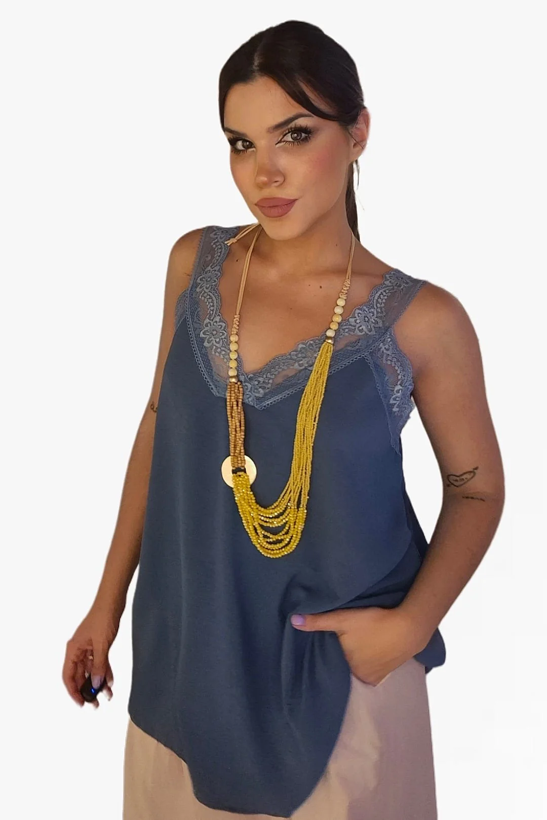 Una básica que nunca falla. Nuestra camiseta lencera, disponible en varios colores, aporta ese aire delicado y femenino que levanta cualquier look. Su escote en V con detalle de encaje y el tejido ligero la convierten en la opción perfecta para el verano. Talla única y súper cómoda, se adapta con estilo a cualquier ocasión.