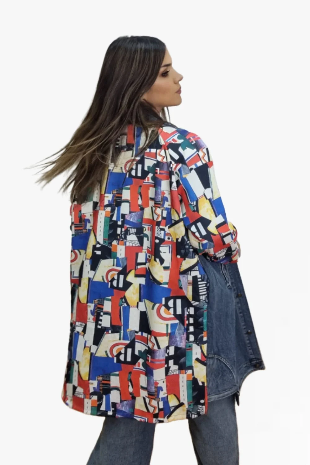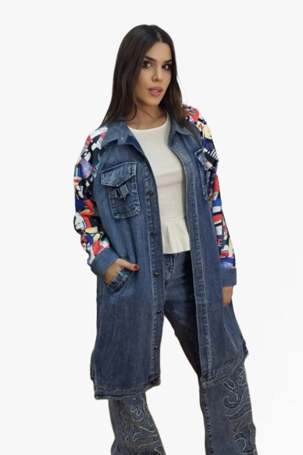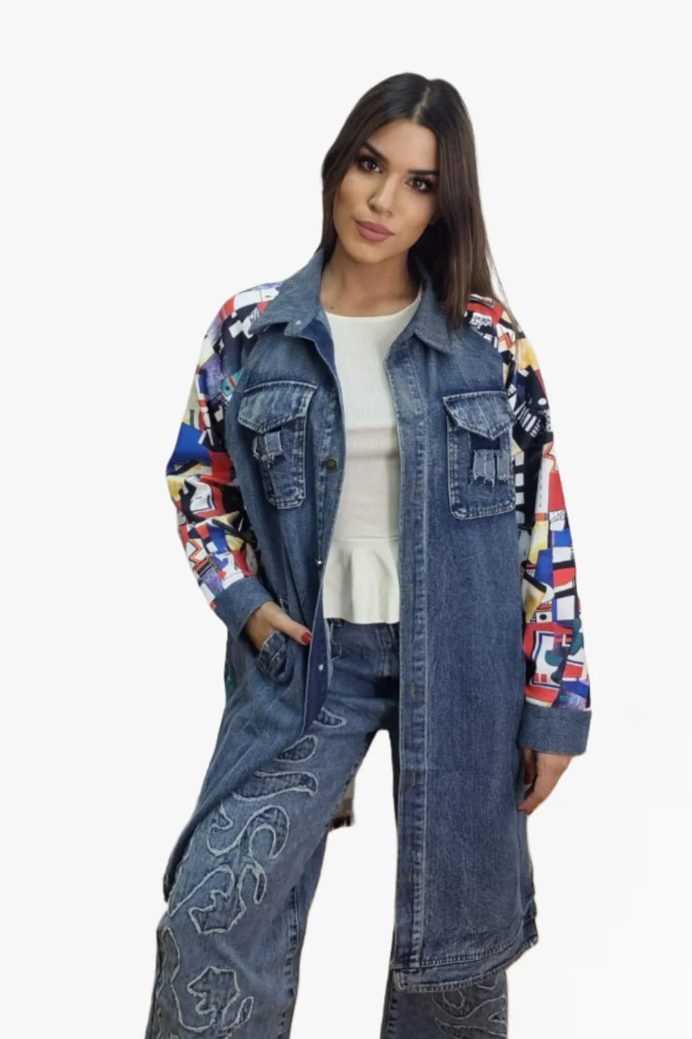 Levita compuesta de dos telas, combinación perfecta y colorida, con bolsillos y abotonada