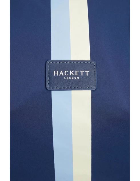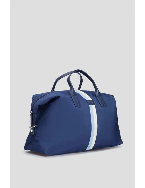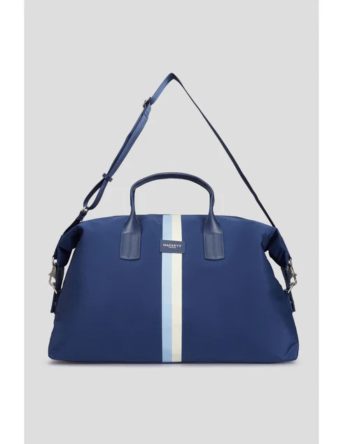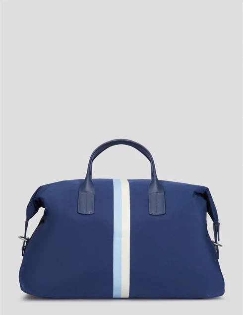 bolso de viaje tipo maletín o bolso de fin de semana, ideal para escapadas cortas. El color principal es un azul marino profundo, con una franja blanca y una gris que lo atraviesan horizontalmente, dándole un toque deportivo y elegante. El bolso incluye tanto asas de mano como una correa ajustable para llevarlo al hombro.