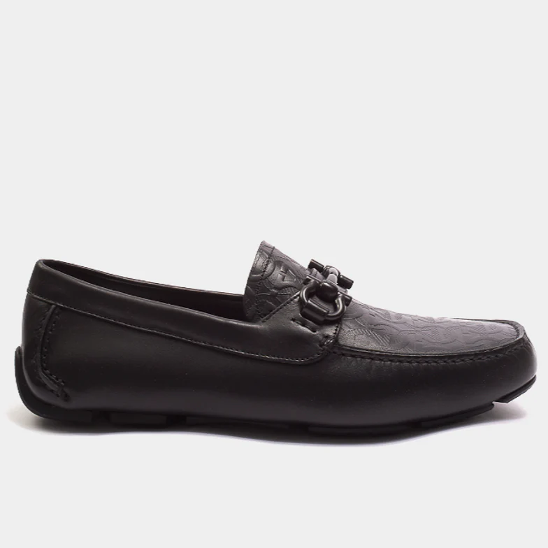 Mocasín versión business. Están confeccionados en piel texturizada, esta versión presenta una puntera ligeramente cuadrada. La suela de goma delgada tiene esquinas redondeadas. Las puntas de metal Gancini cuentan con una construcción similar a un alambre doble para un toque refinado. Perfectos para un look elegante más sencillo. Hecho en Italia.