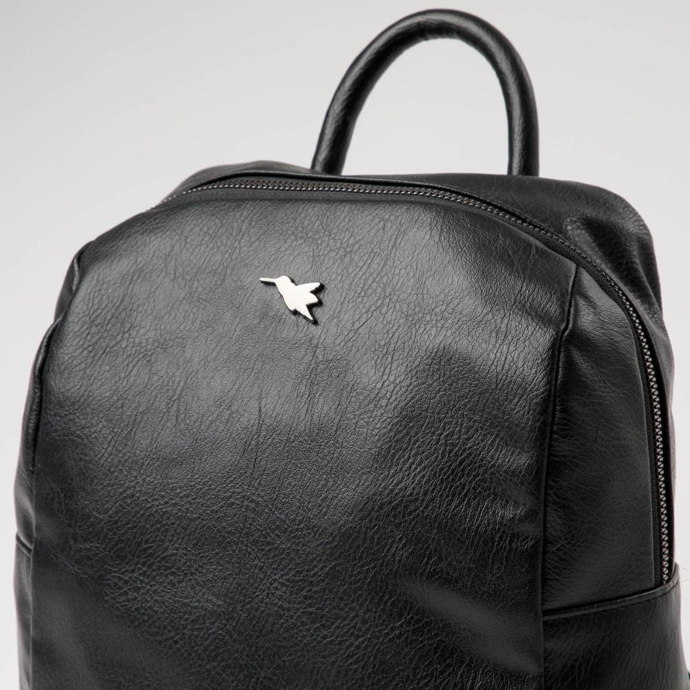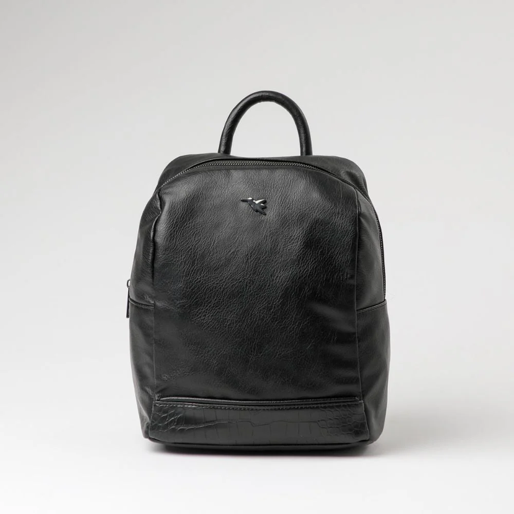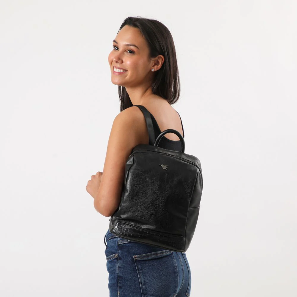 Mochila de ecocuero negro con asa y correas ajustable de nylon. Tiene cierre y la base inferior del frente está cubierta por ecocuero con textura tipo cocodrilo. En su interior hay 1 bolsillo con cierre y 2 abiertos. Los cierres, hebillas y logo son de metal dorado oscuro.