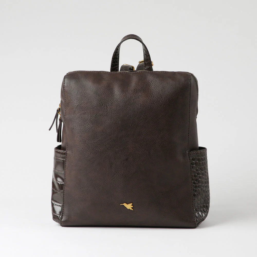 Mochila De Ecocuero Café Con Asa Y Dos Correas Ajustables. Tiene Cierre Y En Su Interior Hay Un Bolsillo Con Cierre Y Dos Abiertos. Lleva Dos Bolsillos Con Snap Por Los Costados Con Textura Tipo Cocodrilo. Los Cierres, Hebillas Y Logo Son De Metal Dorado Oscuro.