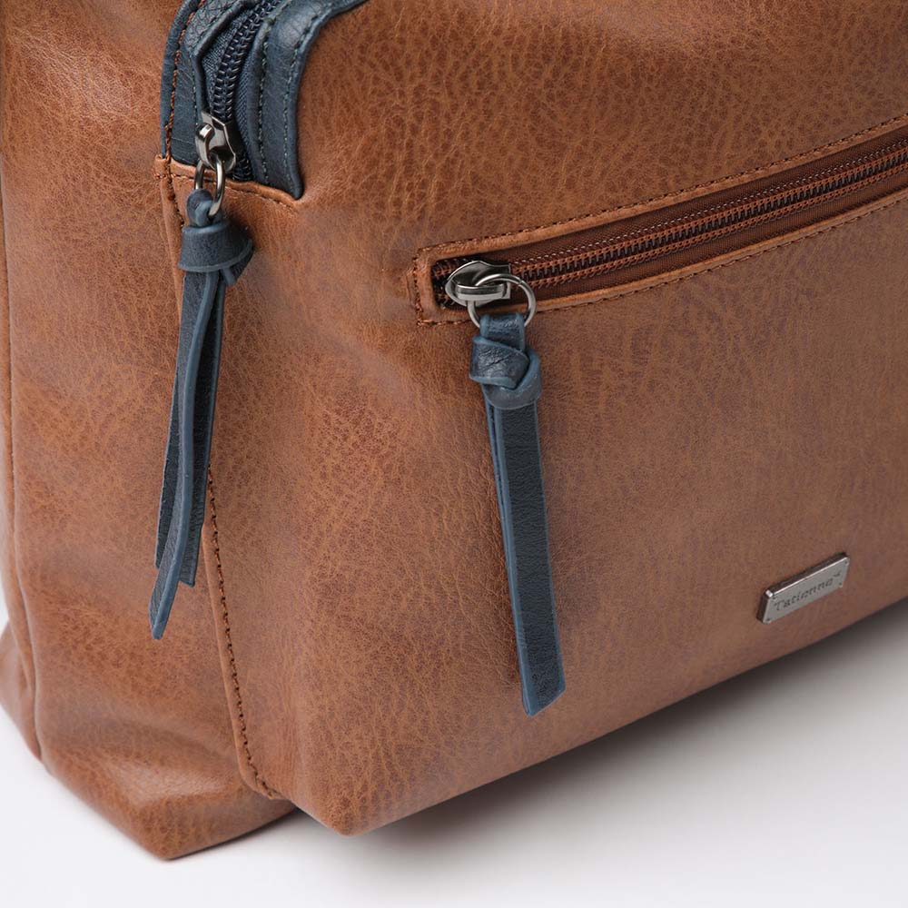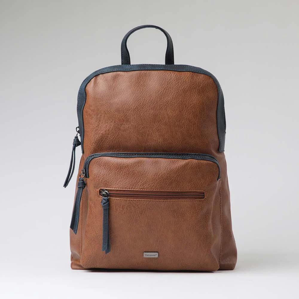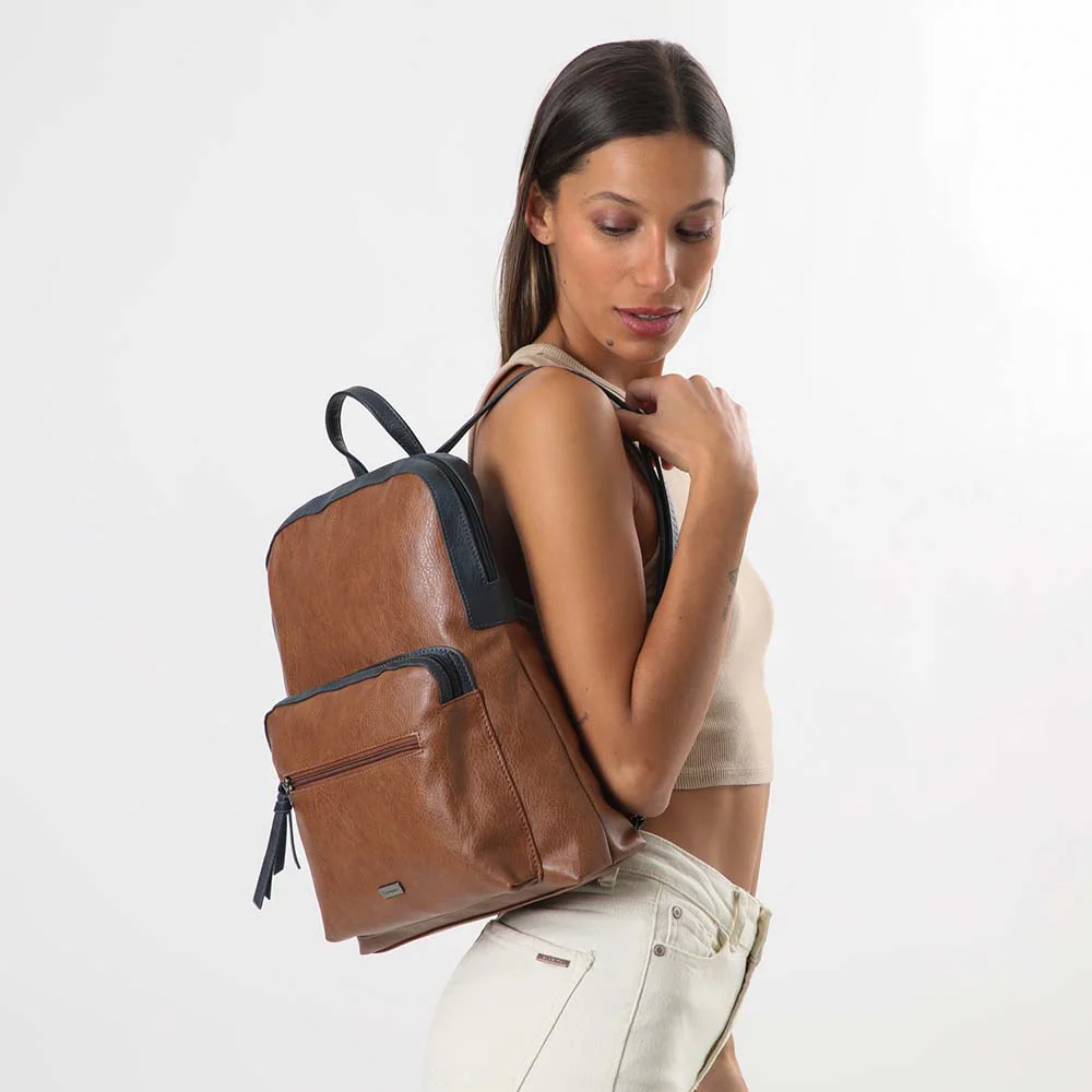 Mochila Tatienne Spring café. Mochila de ecocuero con detalles en color azul.