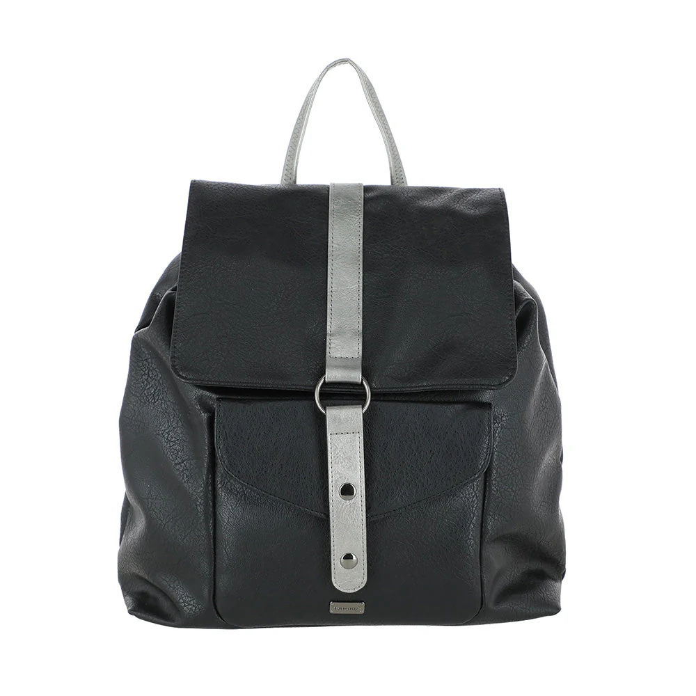 Mochila Tatienne Widow de color negro que pertenece a la colección Geological Future. Cuenta con una correa central plateada de ecocuero para su cierre y un bolsillo externo en la parte inferior.