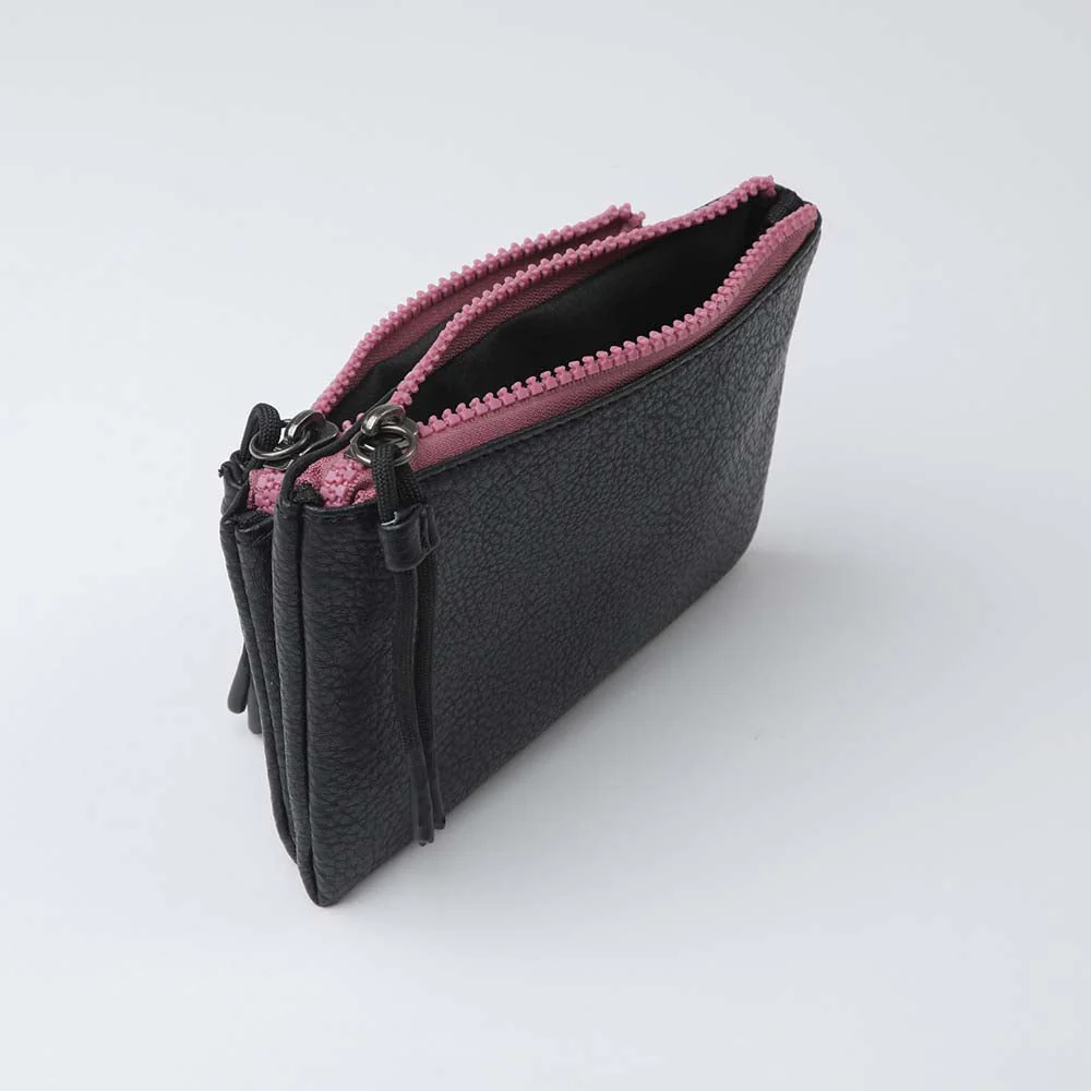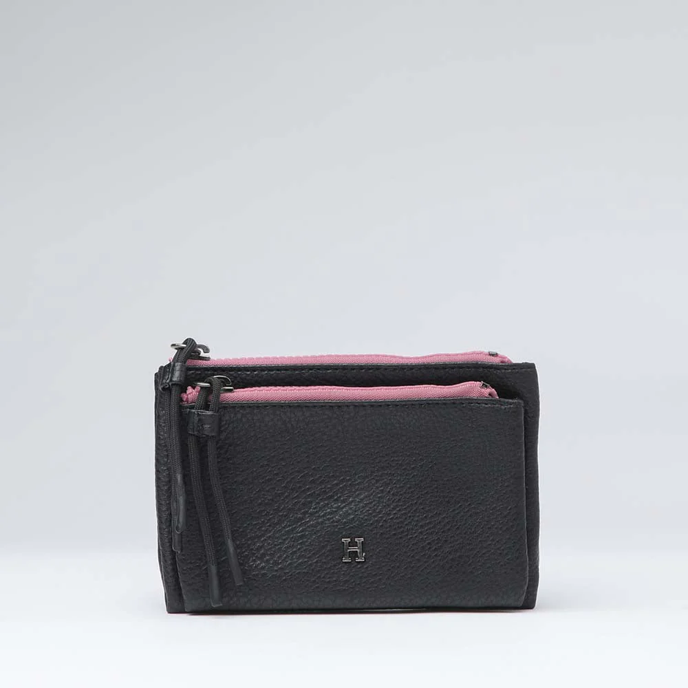 Monedero Humana Deep color negro perteneciente a la colección Planetary Alignment. Monedero estuche negro con doble cierre de color fucsia.