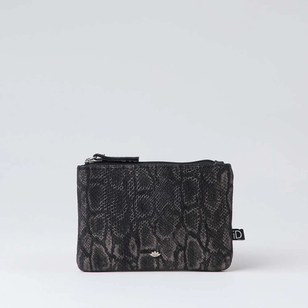Monedero iD Rita de color negro. Monedero de ecocuero con textura de sepriente con tonos grises.