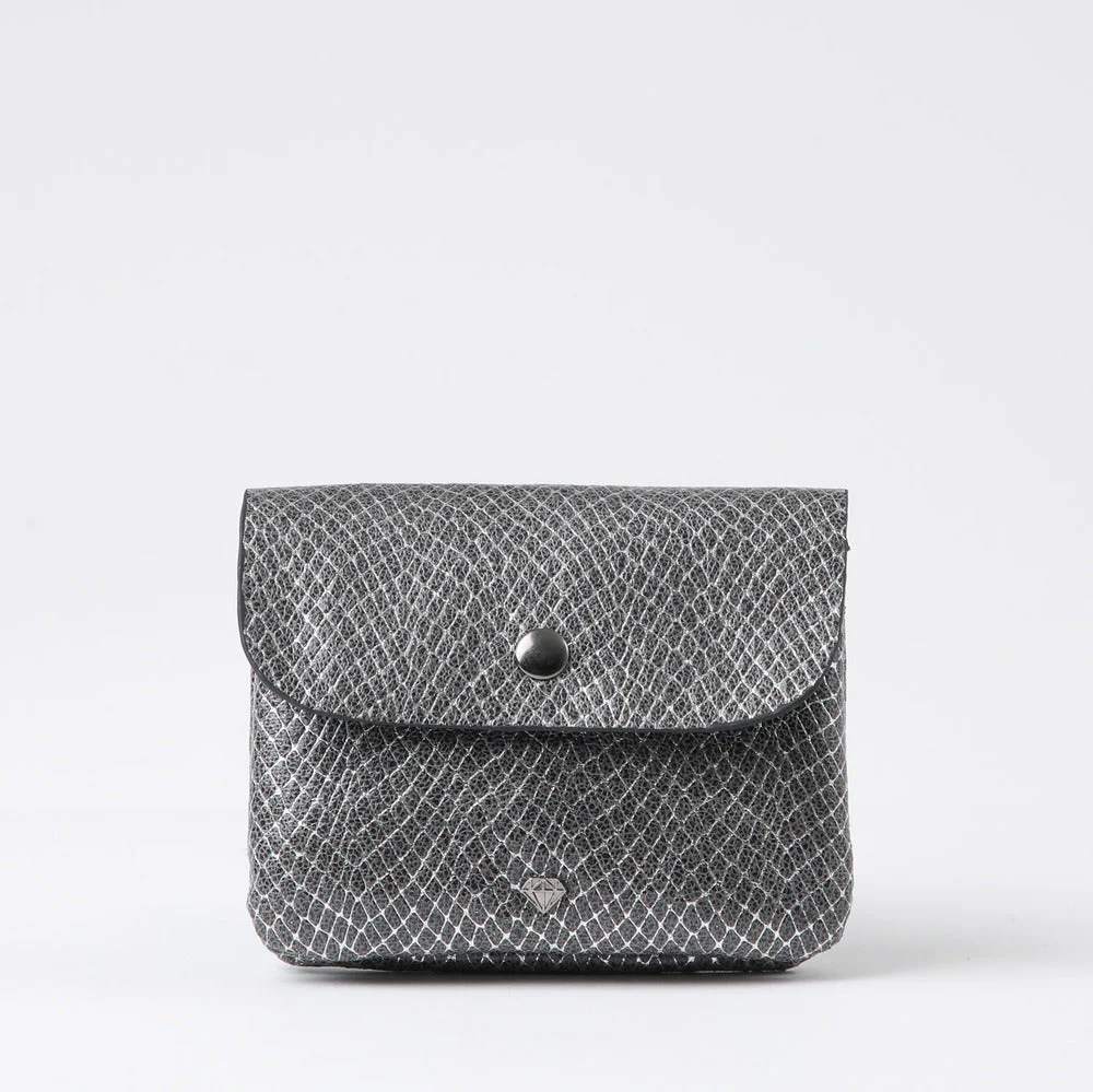 Monedero estampado ecocuero red plateada de solapa con broche. Tiene 2 compartimientos internos y un con cierre.