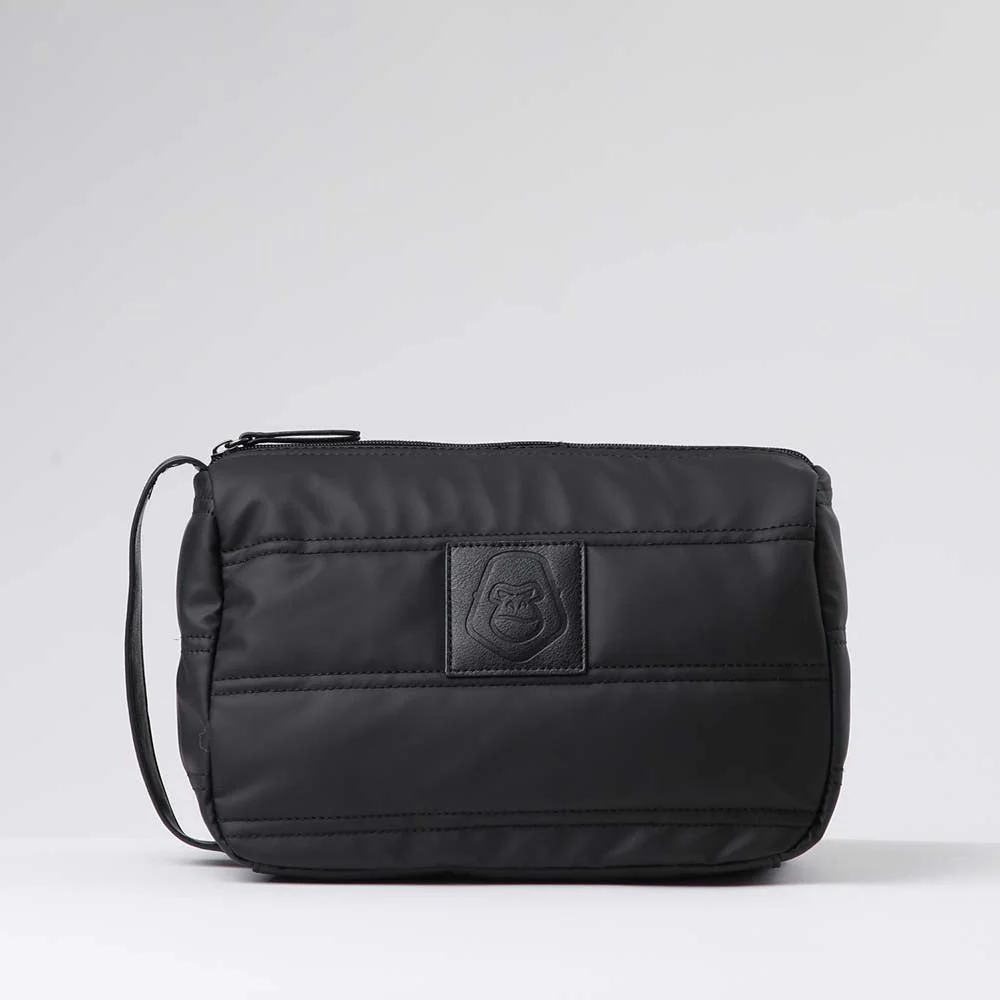 Neceser Gorillaz Rufino de color negro. Este neceser de nylon negro tiene un diseño acolchado, un asa de ecocuero negra en un costado y cuenta con un forro impermeable con un bolsillo interno.