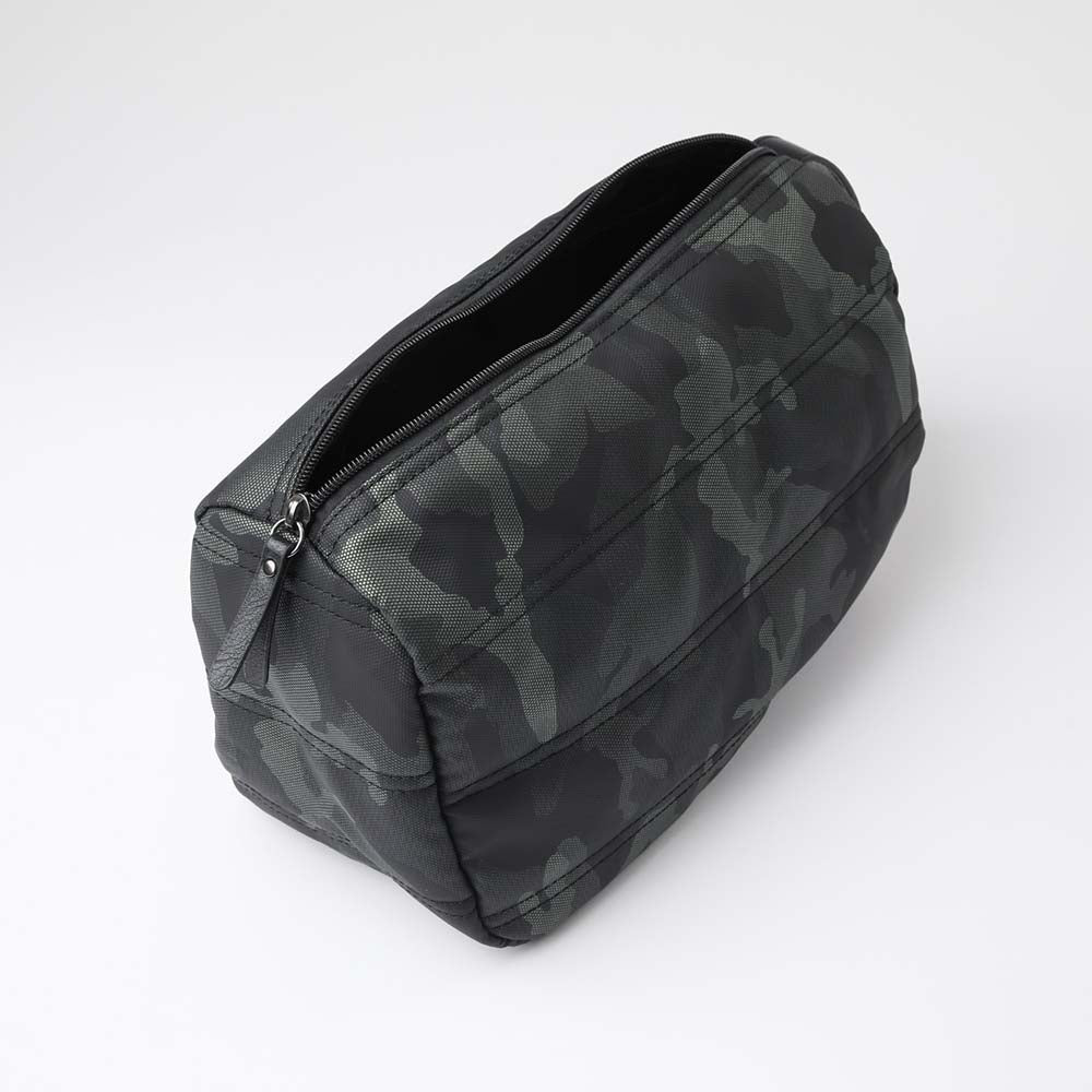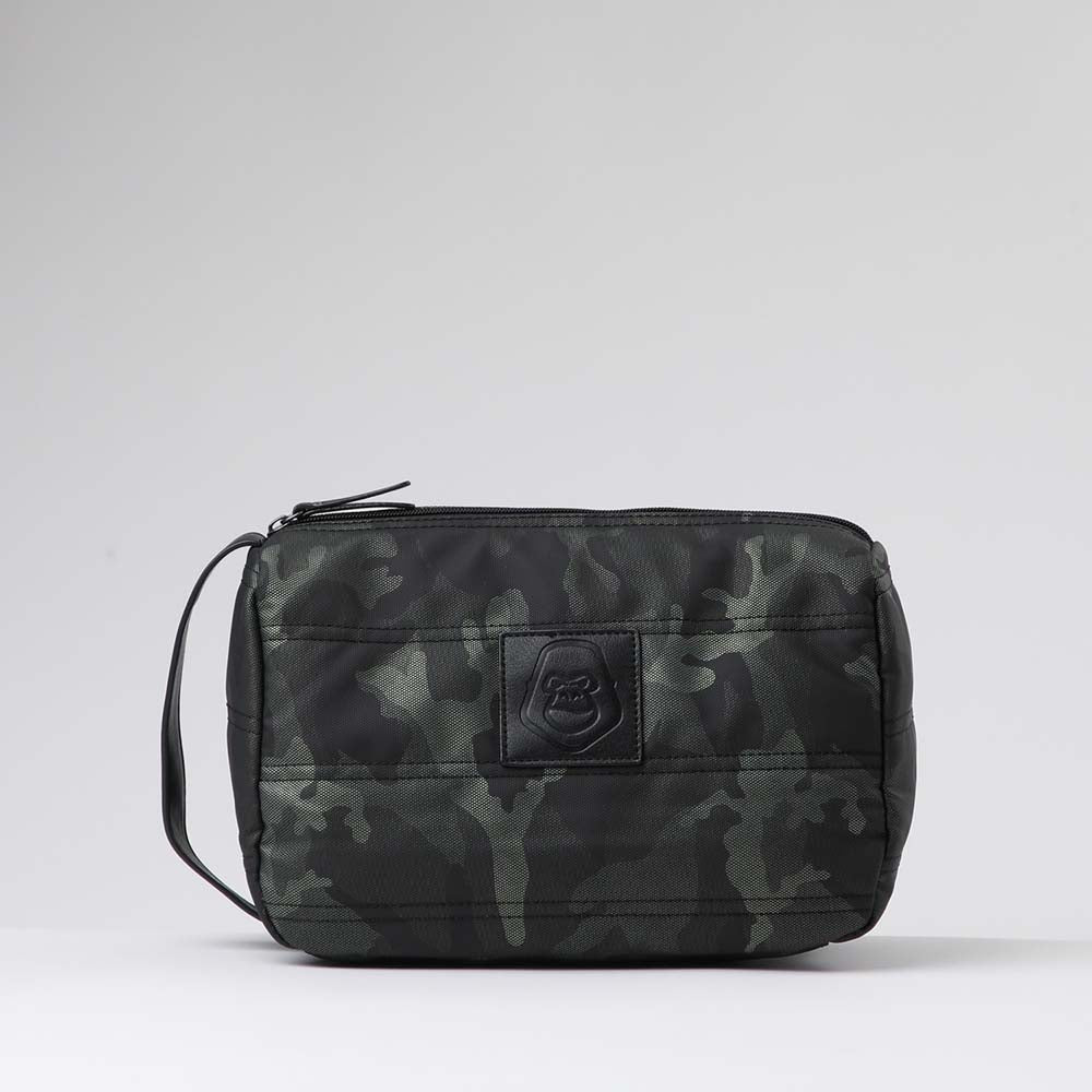 Neceser Gorillaz Rufino de color negro. Este neceser de nylon verde con estampado de camuflaje militar tiene un diseño acolchado, un asa de ecocuero negra en un costado y cuenta con un forro impermeable con un bolsillo interno.