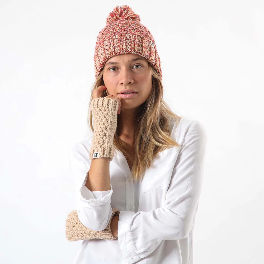 Pack de gorro tejido de color beige, rojo, morado y rosado con pompón en su parte superior, y mitones de color beige.