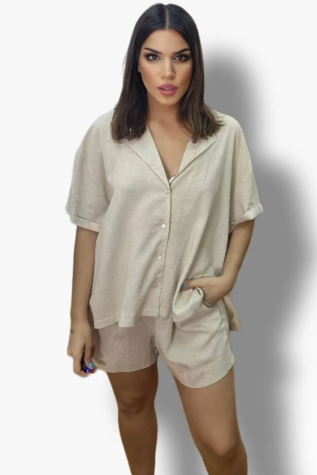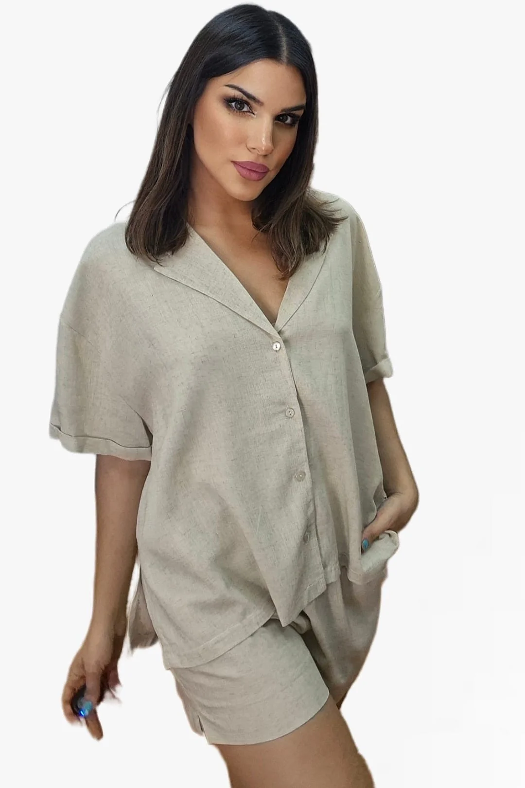 Luce el conjunto completo con la Camisa Oversize abotonada a juego, o crea looks más casuales con tops lisos, camisetas básicas o blusas fluidas. Ideal para escapadas, paseos o planes relajados.
