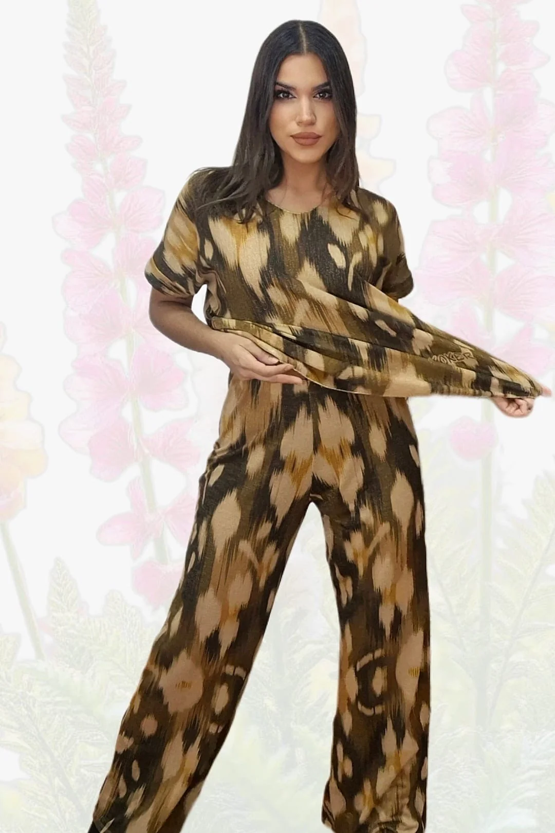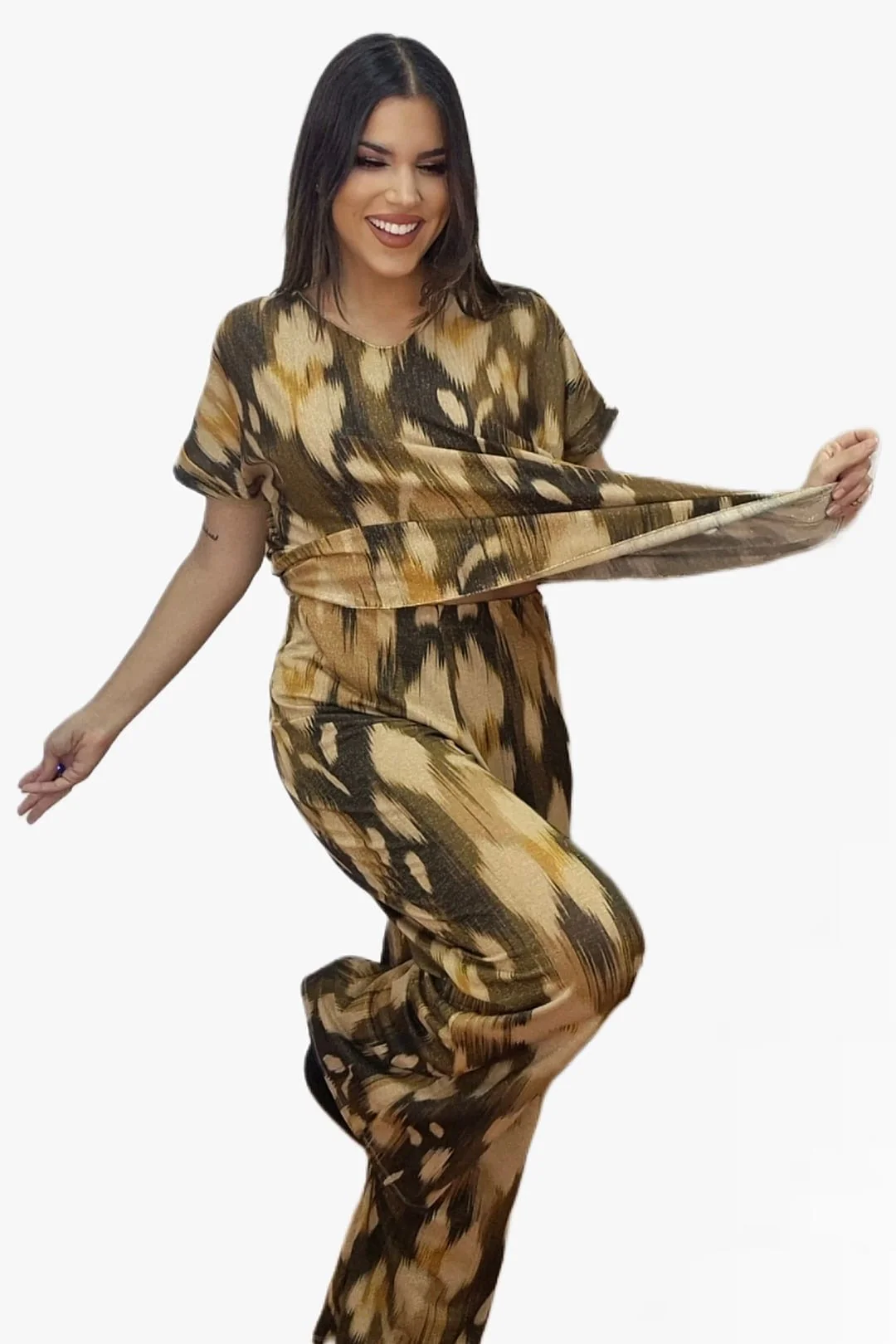 - Pantalón fluido de lurex estampado oliva