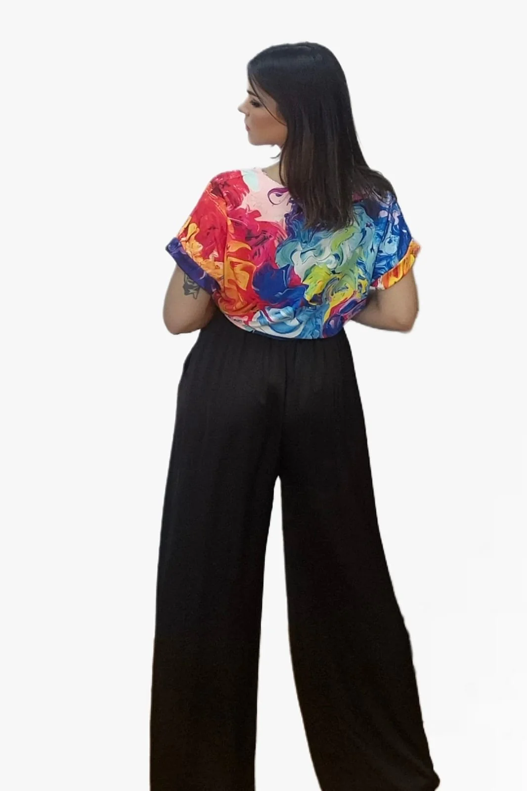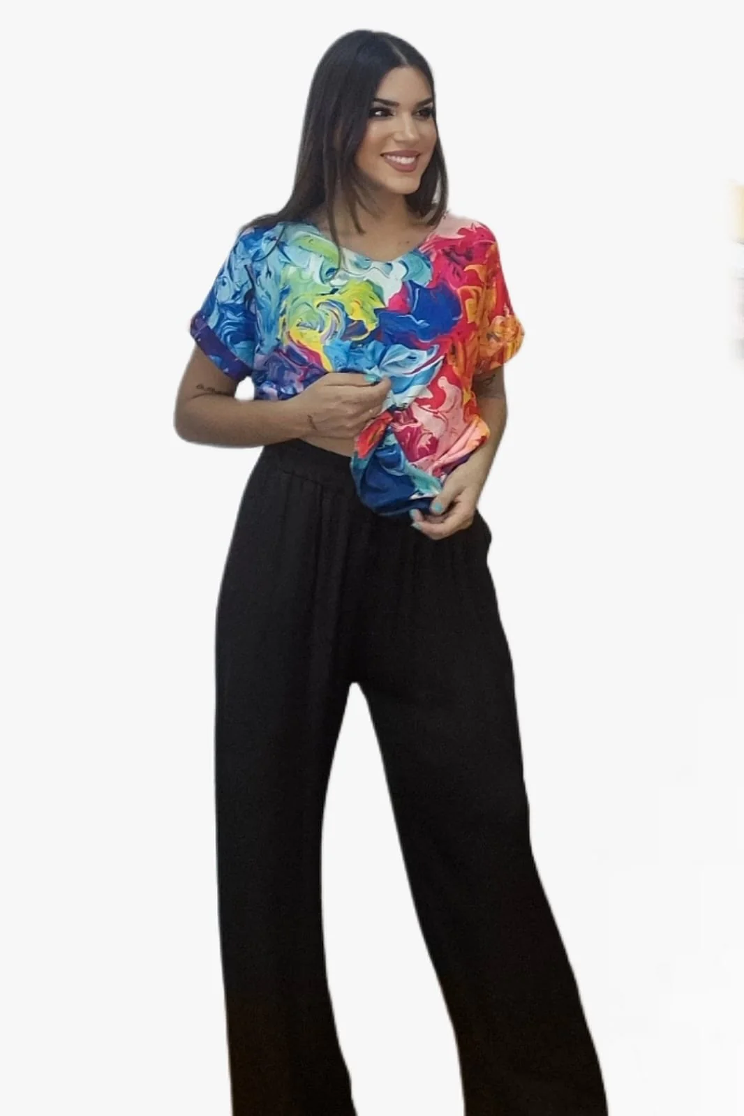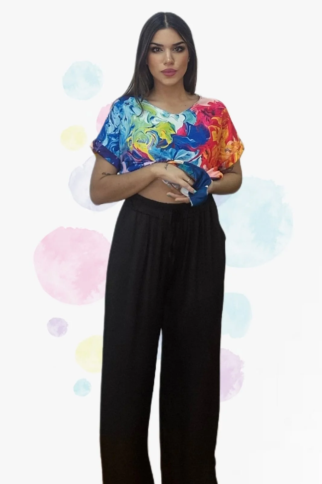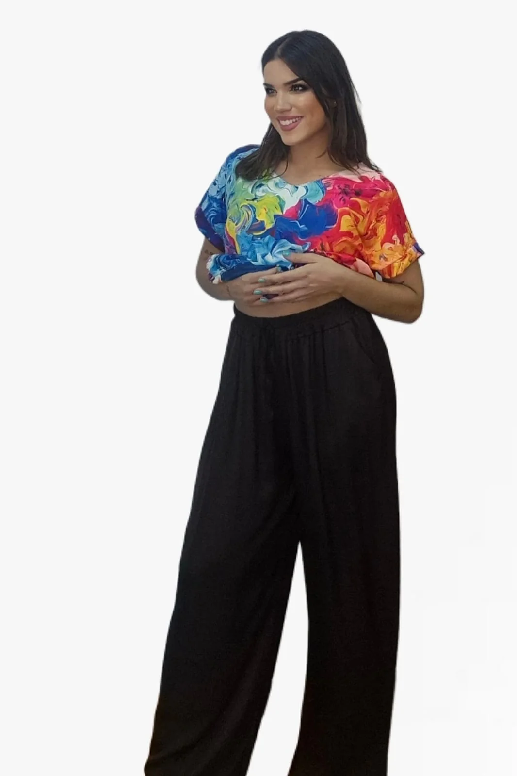 Fluido, fresco y elegante. El pantalón palazzo cordón está confeccionado en 100% viscosa, lo que le aporta una caída suave y movimiento natural. Su diseño de talle medio con cintura engomada y cordón ajustable se adapta con comodidad a diferentes siluetas (talla única), convirtiéndolo en un básico versátil y muy favorecedor.