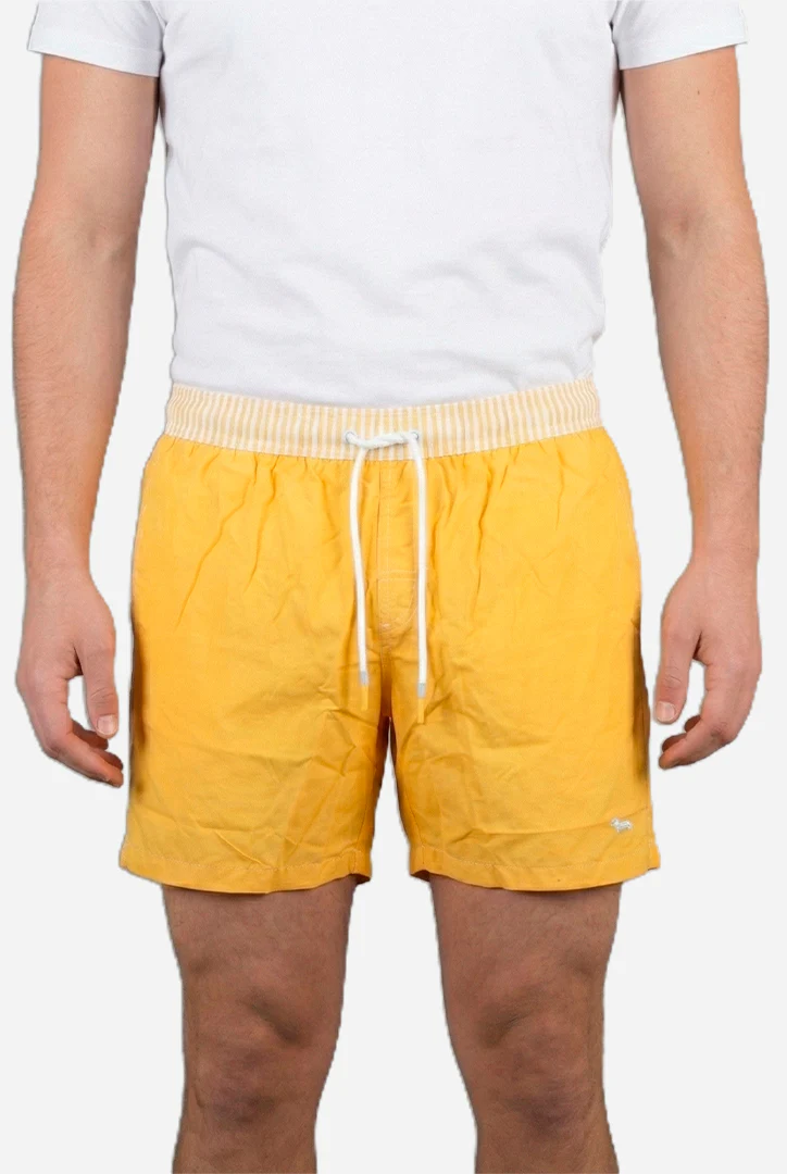 La prenda principal que se muestra en la imagen es un par de pantalones cortos de baño amarillos de la marca italiana Harmont & Blaine.
