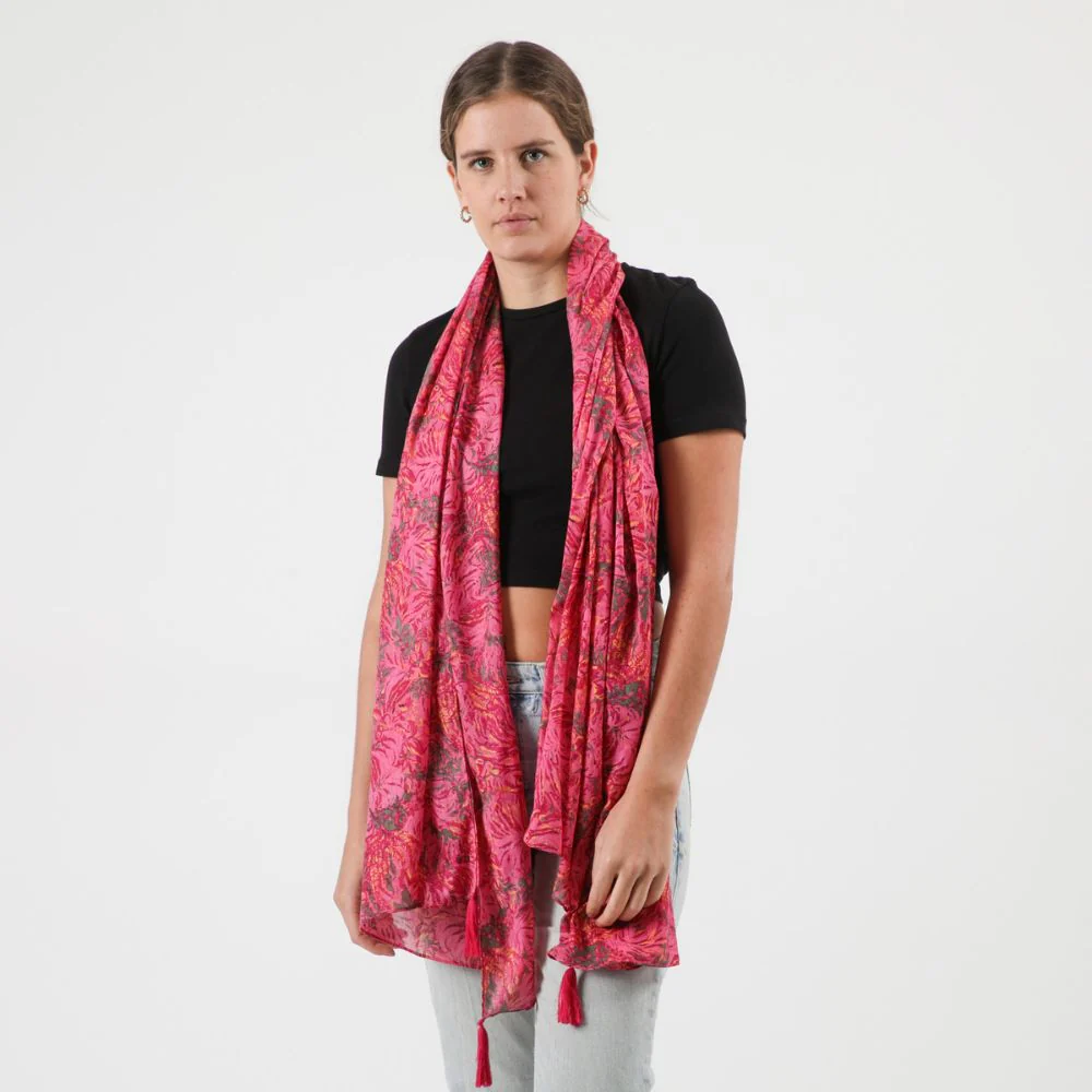 Pañuelo de algodón estampado con motivos de hojas abstractas fuscias, verdes con detalles en amarillo con terminaciones en borlas en las cuatro esquinas del pañuelo.