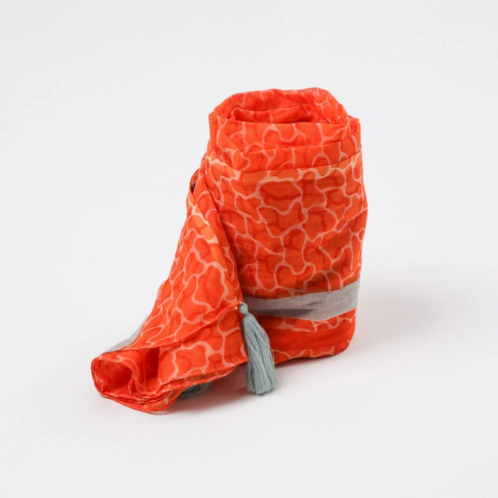 Pañuelo de algodón naranjo estampado con motivos de manchas de agua en distintos tonos naranjos con franjas celestes a lo largo del pañuelo con borlas celestes en sus cuatro puntas.