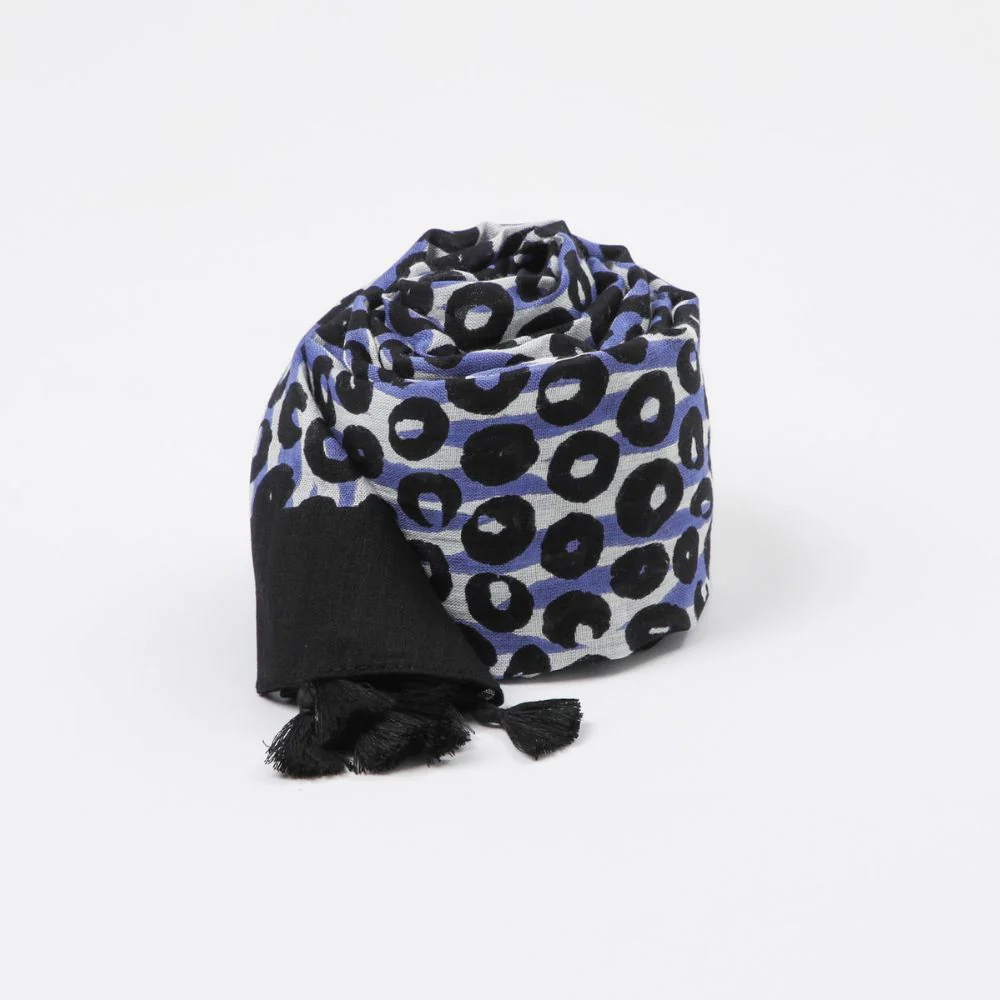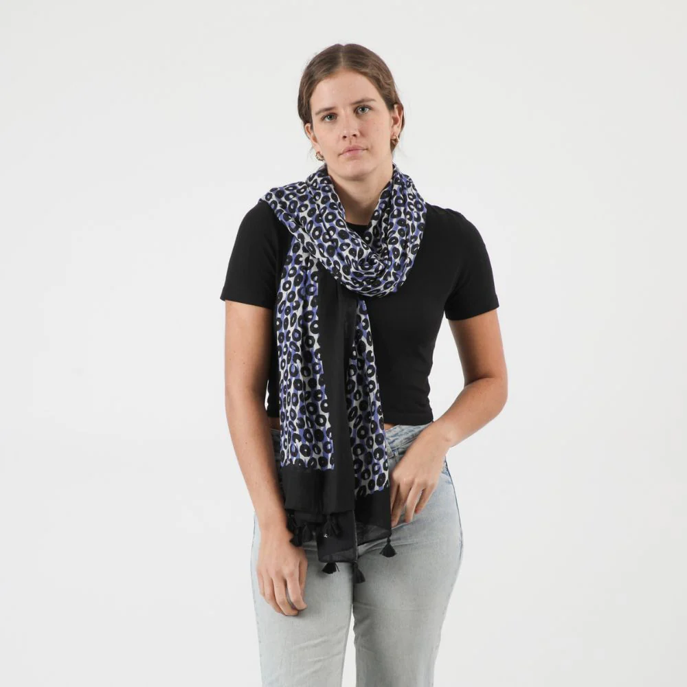 Pañuelo estampado con motivos de manchas de leopardo negras sobre manchas de tigre azules en fondo blanco con un marco negro en los bordes del pañuelo con terminaciones con borlas en los extremos.