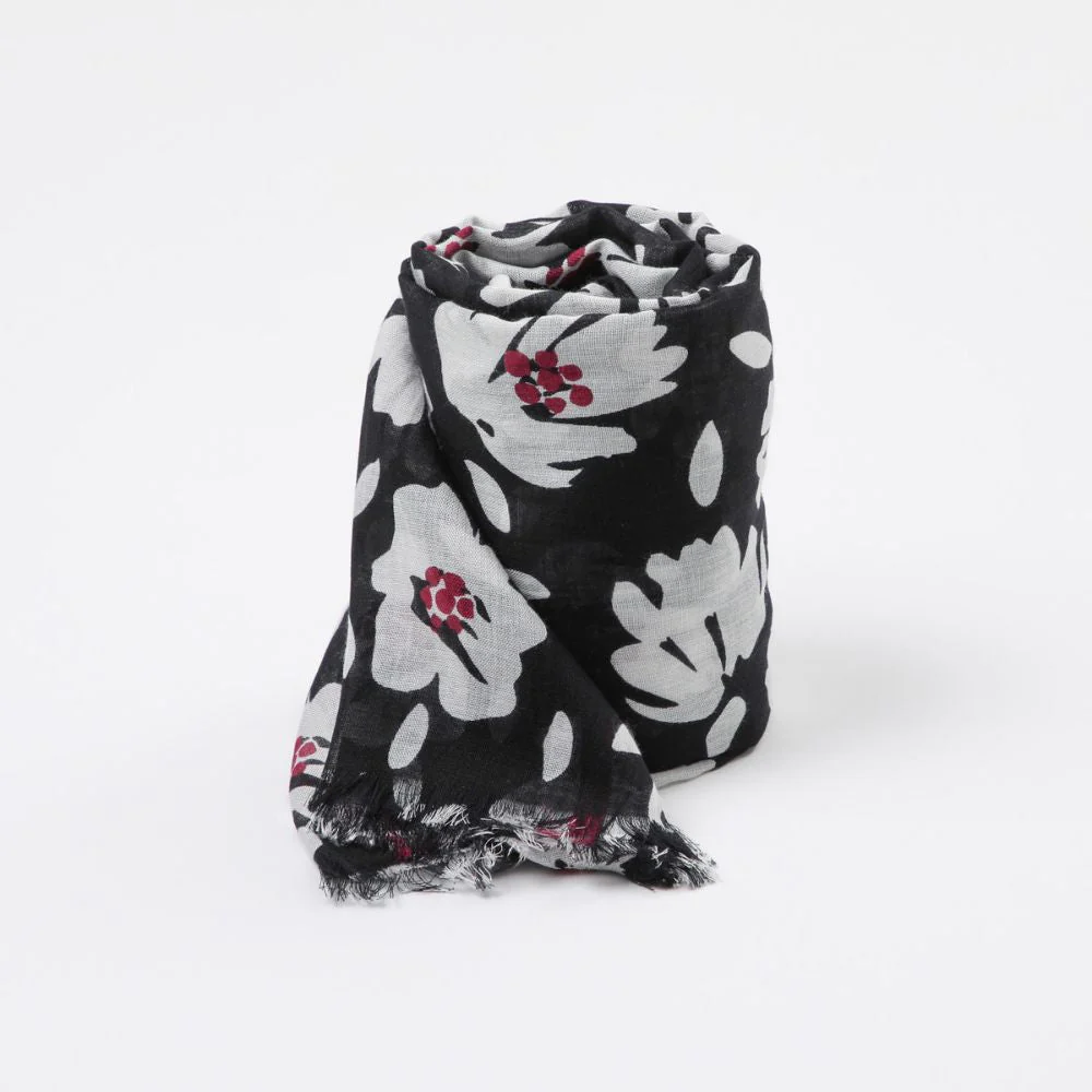 Pañuelo negro estampado con motivos florales blancas con centros rosados sobre un fondo negro con unas lineas paralelas rosadas que dividen dos tamaños del estampado con terminaciones desflecadas.