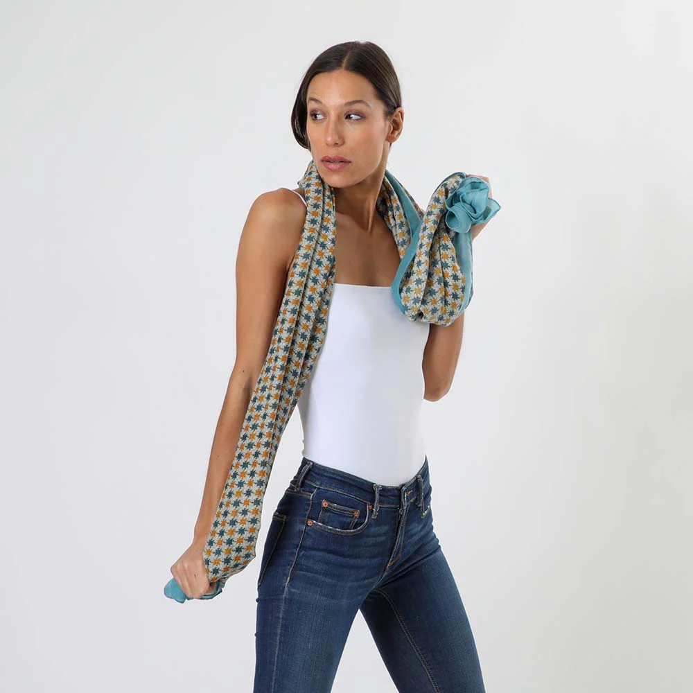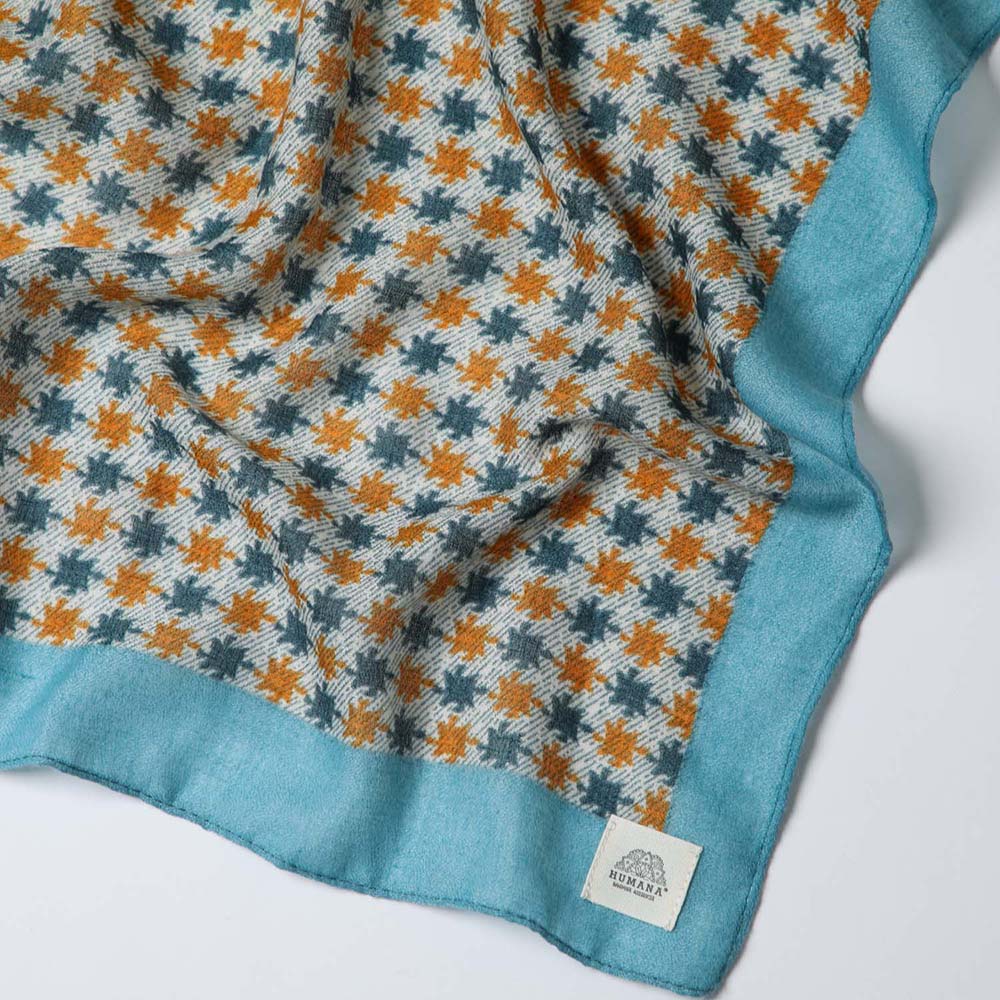 Pañuelo estampado Humana Barbate de color celeste perteneciente a la colección Cornflower Blue. Su diseño es un borde celeste y al centro un patrón de figuras abstractas azules y naranas en un fondo gris.