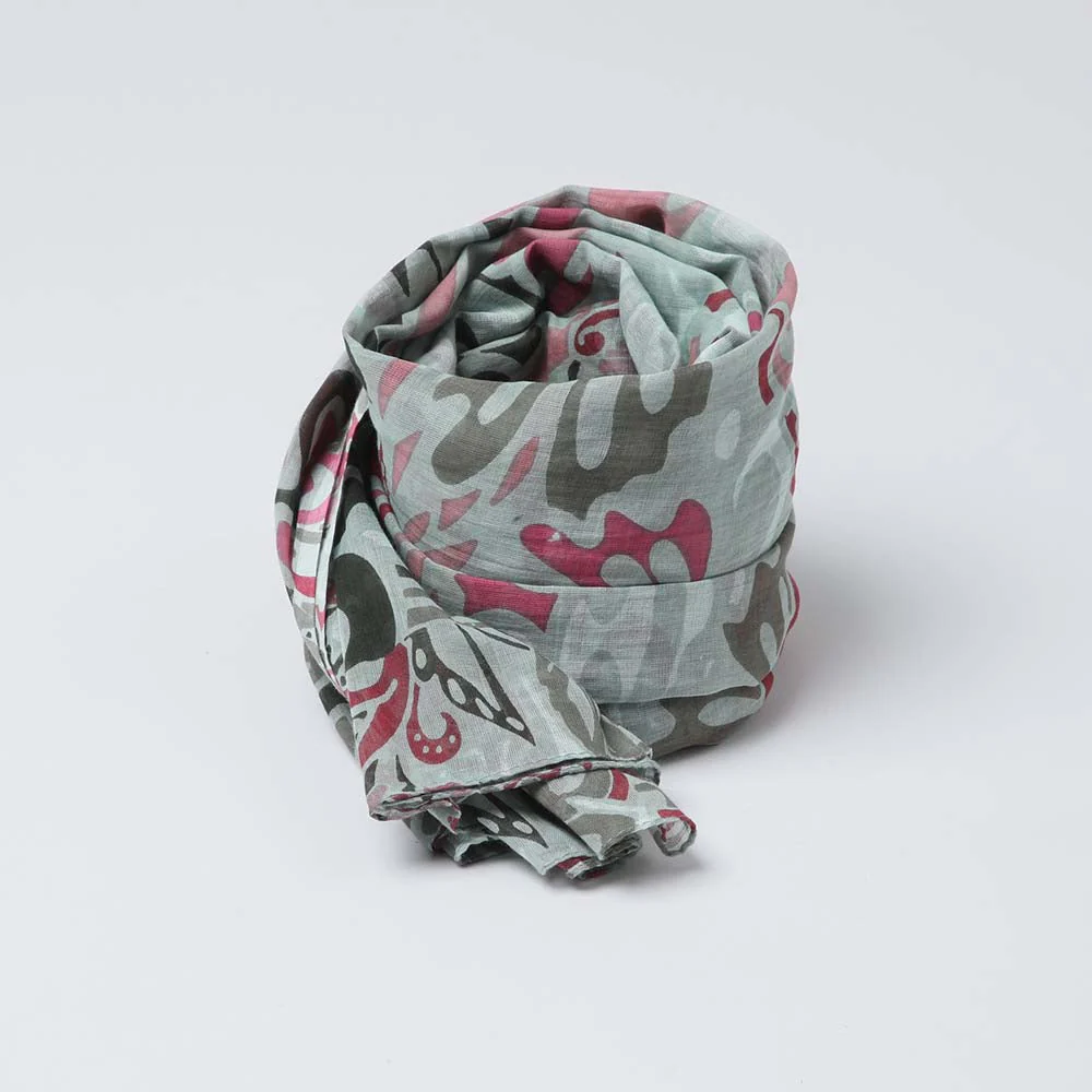 Pañuelo estampado iD Boho de color verde. Su diseño es un estampado en tonalidades de verde y burdeo