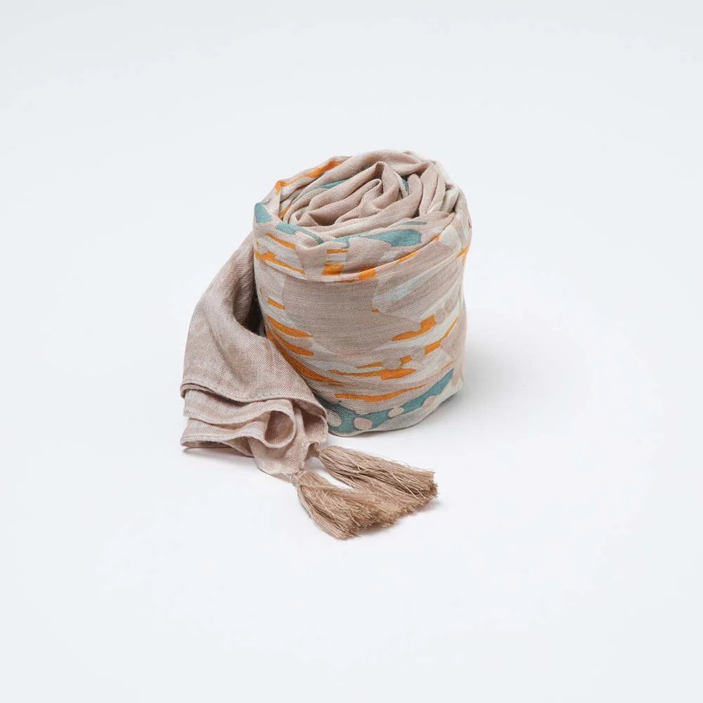 Este es un pañuelo con una borla verde en cada esquina y un estampado con motivo abstracto de colores beige, amarillo, café y celeste, sobre este estampado hay otro con motivo rococó de color beige y en ambos extremos cortos un segundo estampado con motiv