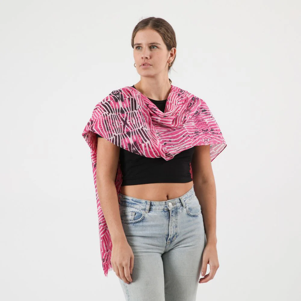 Pañuelo de algodón rosado estampado con motivos de rayas rosadas abstractas animal con manchas negras sobre un fondo blanco con terminaciones desflecadas.