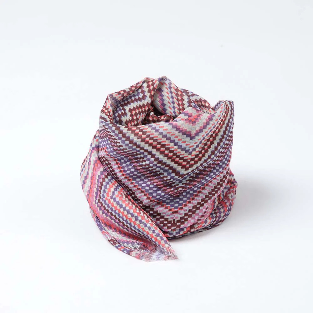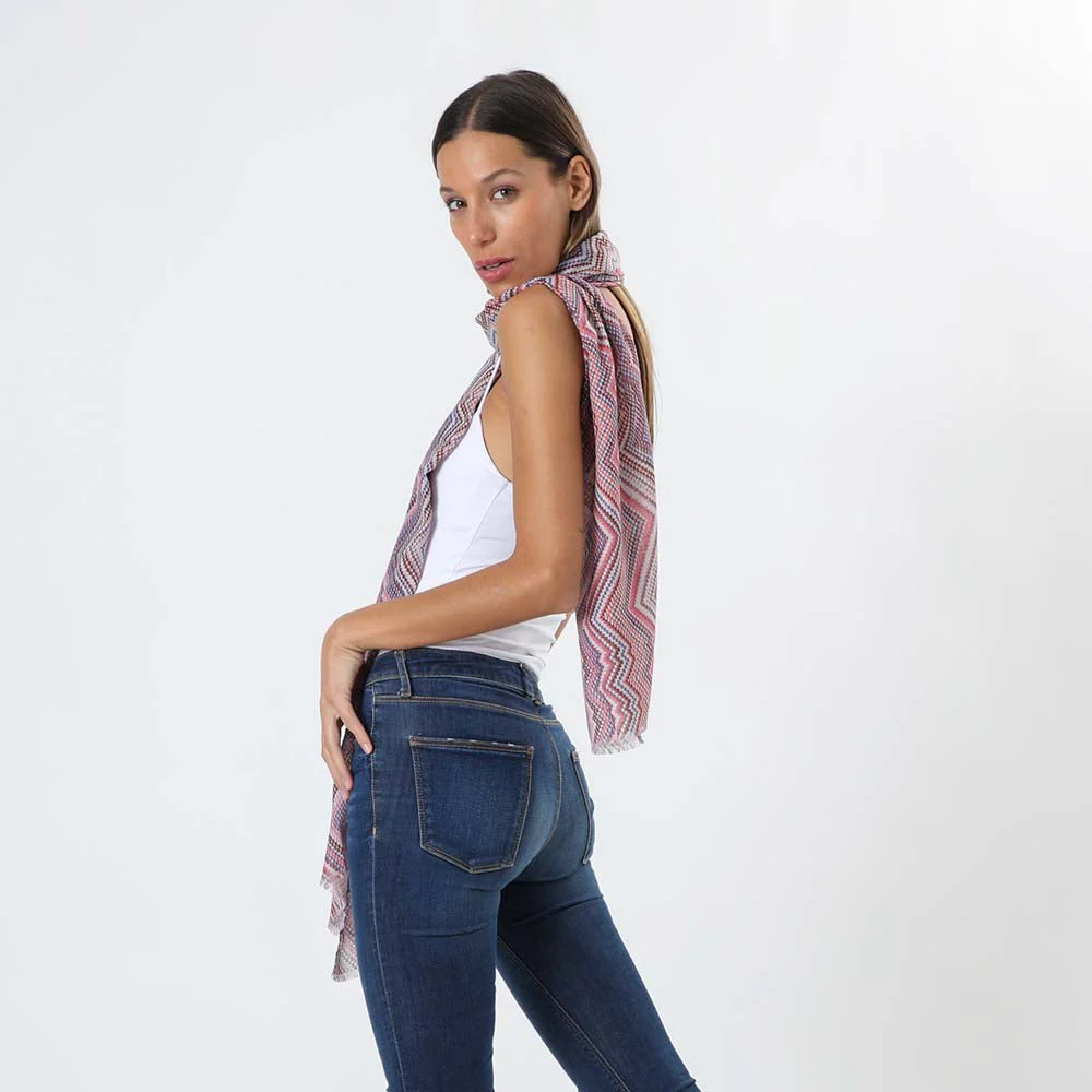 Pañuelo estampado Humana Chevron de color rosado perteneciente a la colección Floral Nature. Su diseño es un estampado de lineas zigzag en tonalidades de rosado, morado, naranjo y blanco.