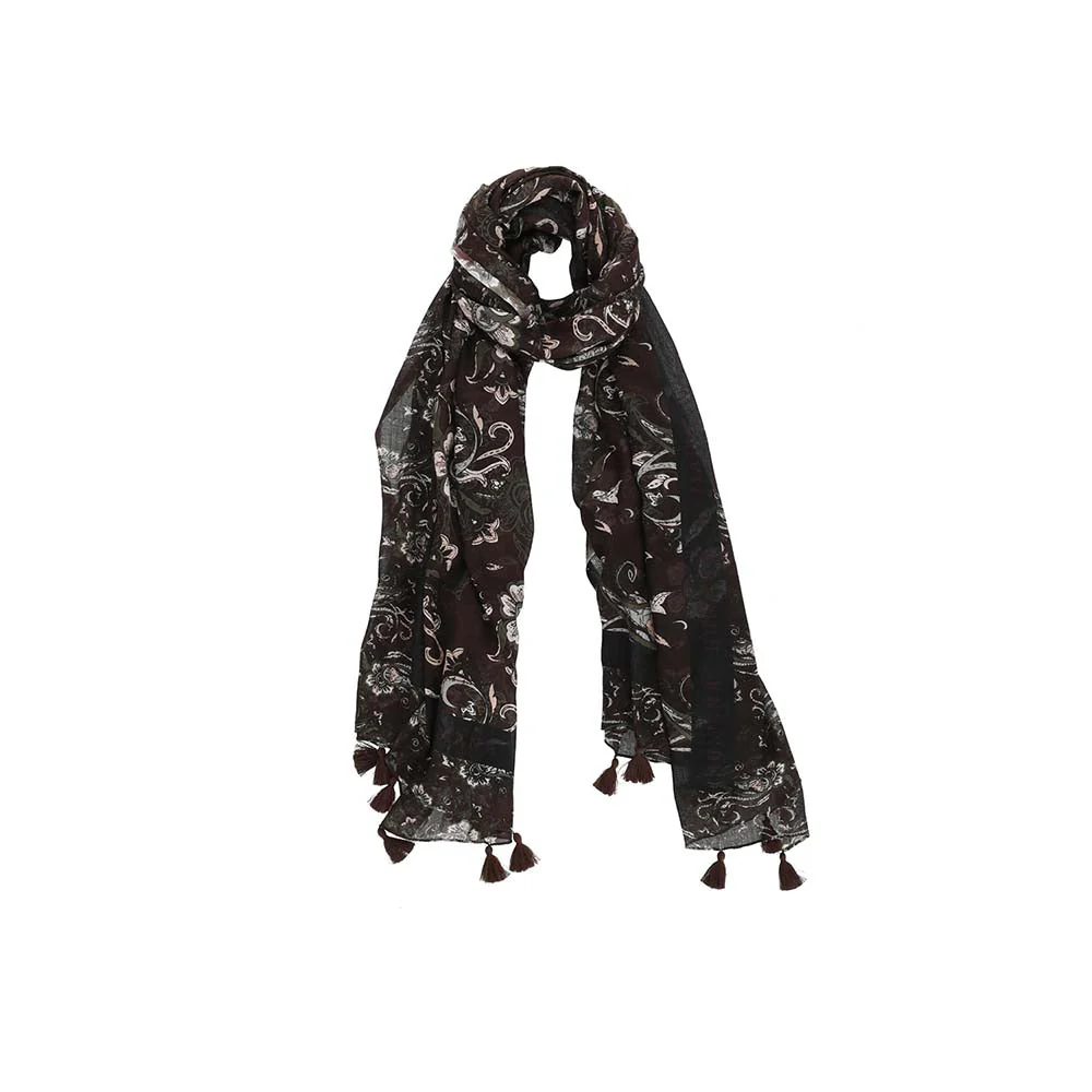 Pañuelo Humana Floral estampado de color negro que pertenece a la colección Modular Black. Cuenta con un diseño floral con toques de beige y verde con terminación en borlas café.
